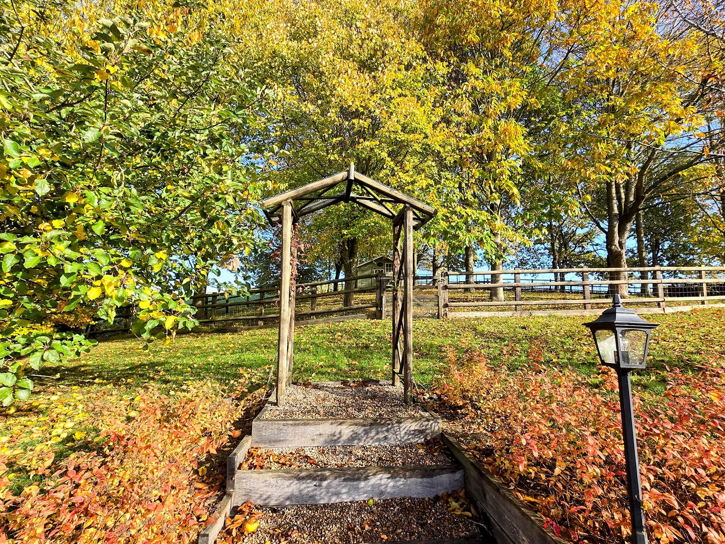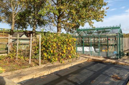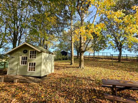 Playhouse, compost bins, enclosed vegetable plot and chicken enclosure. Multiple outside power sockets and water taps.