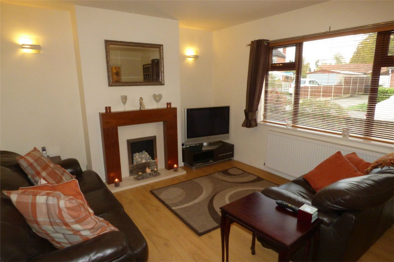 Having an attractive feature fireplace housing a living flame gas fire, central heating radiator, laminate wooden flooring and upvc sealed unit double glazed window.