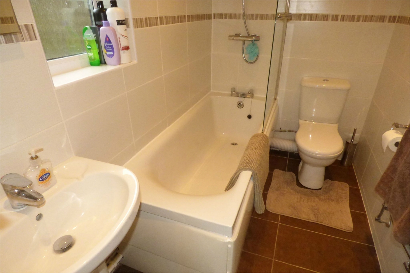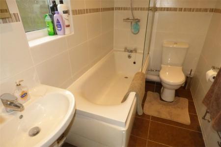 Being fully tiled to the walls and having a modern white suite comprising a panelled bath with shower over, pedestal wash hand basin and low level WC. Heated towel rail, inset ceiling spot lights, ceramic tiled flooring and upvc sealed unit double glazed window.