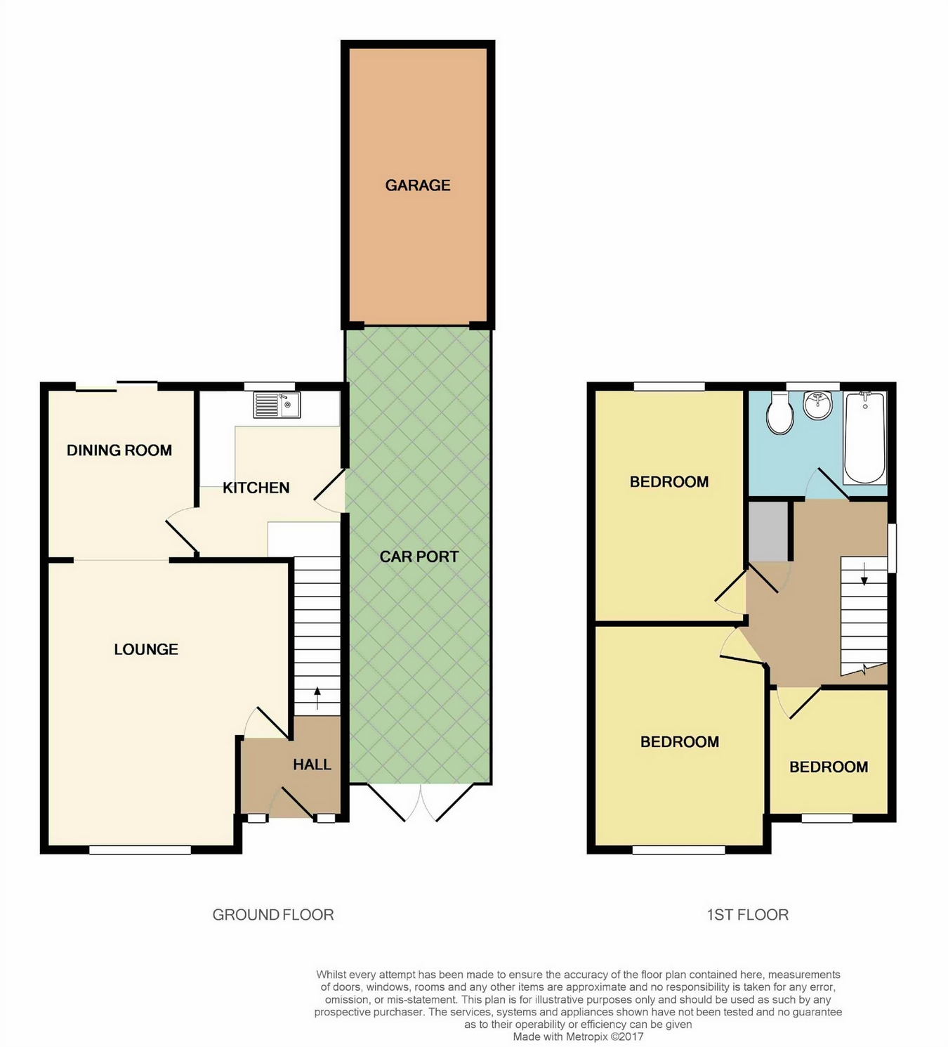 Briefly comprising: Hall, lounge, dining room and kitchen. Landing, three bedrooms and bathroom. Garage, car port and gardens. EPC rating D.