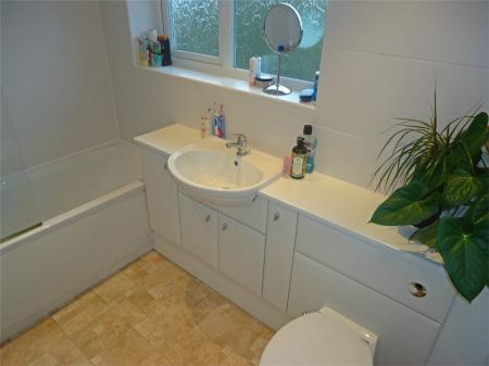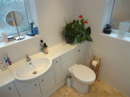 Being fully tiled to the walls and vinyl flooring. Having a white suite comprising of low level WC, wash hand basin with cabinet surround and panelled bath with gas powered shower above. Heated towel rail and two upvc sealed unit double glazed windows.