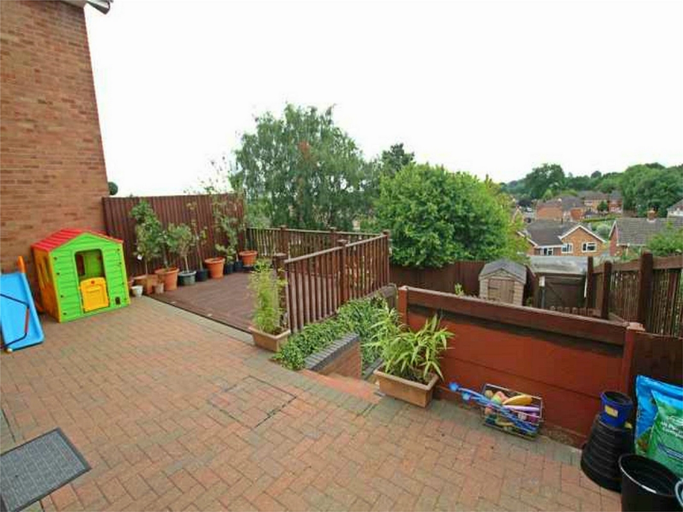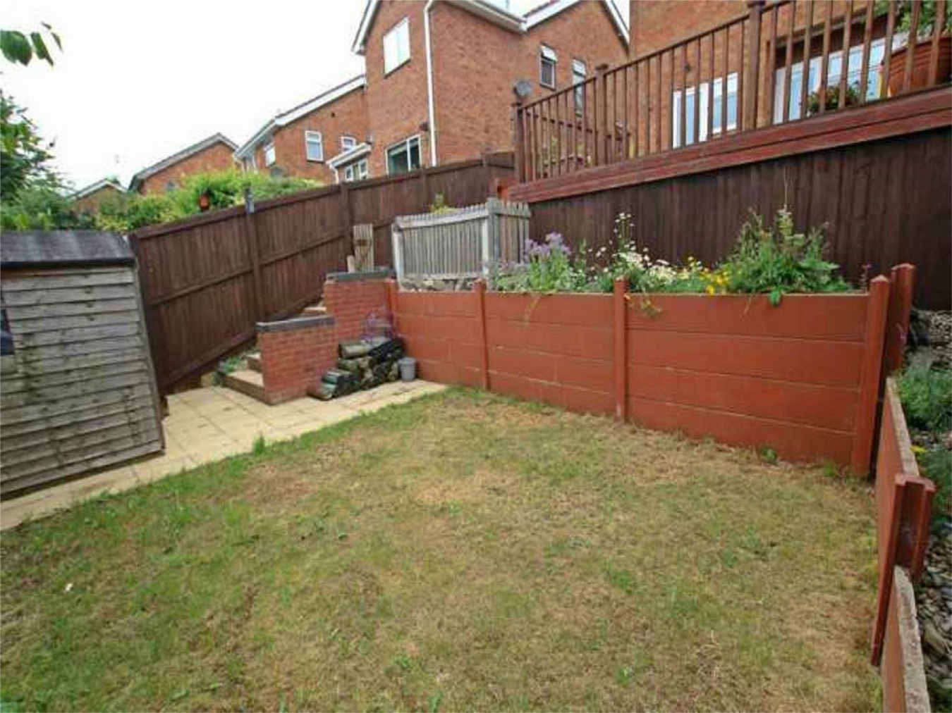 Having a good sized patio area leading into decking, steps down to a further patio area and continuing a lawn area. Gated access to the side entrances to the front and the rear.