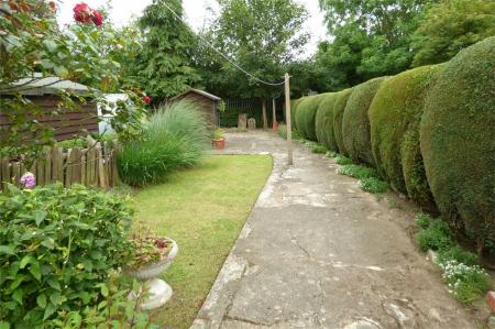 Foregarden and shared tunnel access leading to the good sized rear garden, which has a patio, lawned area and further paving. Outbuilding.
