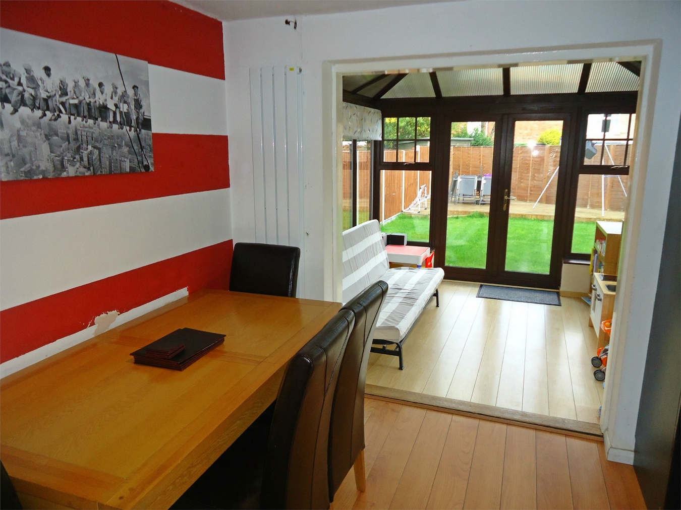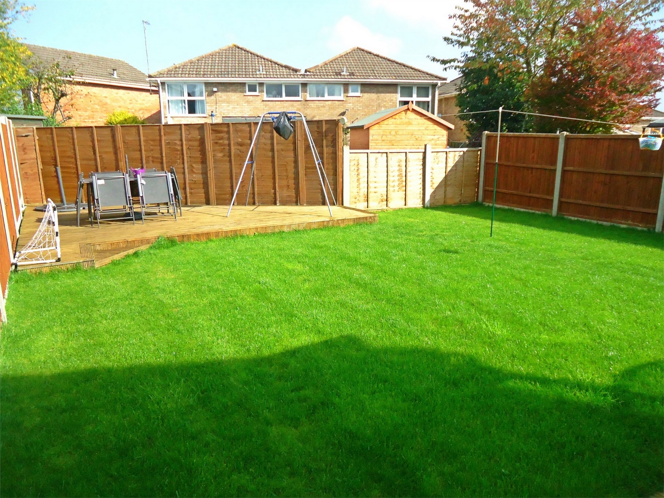 The rear garden has a patio, lawn, decking and fenced boundaries.