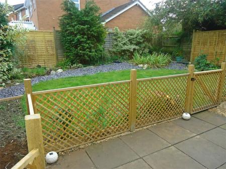 Foregarden and side pedestrian access leading to the rear garden, which has a patio area, lawn and borders.