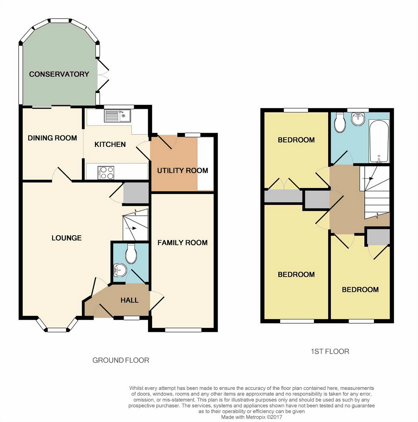 The accommodation briefly comprises: Hall, guests cloakroom, lounge, family room, dining room, conservatory, kitchen and utility room. Landing, three bedrooms and bathroom. Driveway and gardens. EPC rating D.