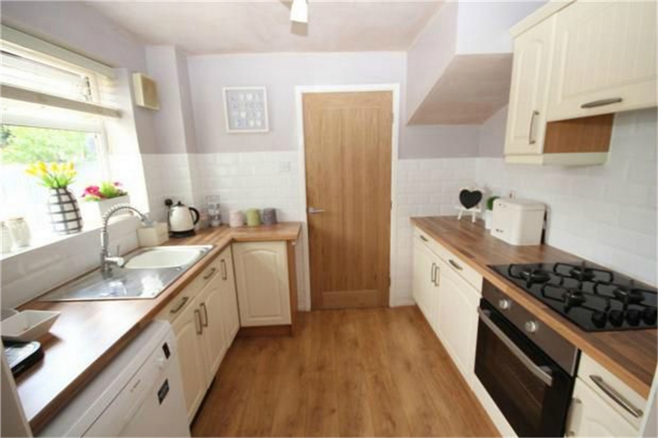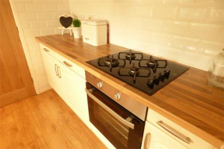 Having a single drainer stainless steel sink with mixer tap, fitted base unit, additional base cupboards with work surfaces over and fitted wall cupboards. Built-in oven and hob. Plumbing for an automatic dishwasher, laminate wooden flooring, plinth heater and upvc sealed unit double glazed window.