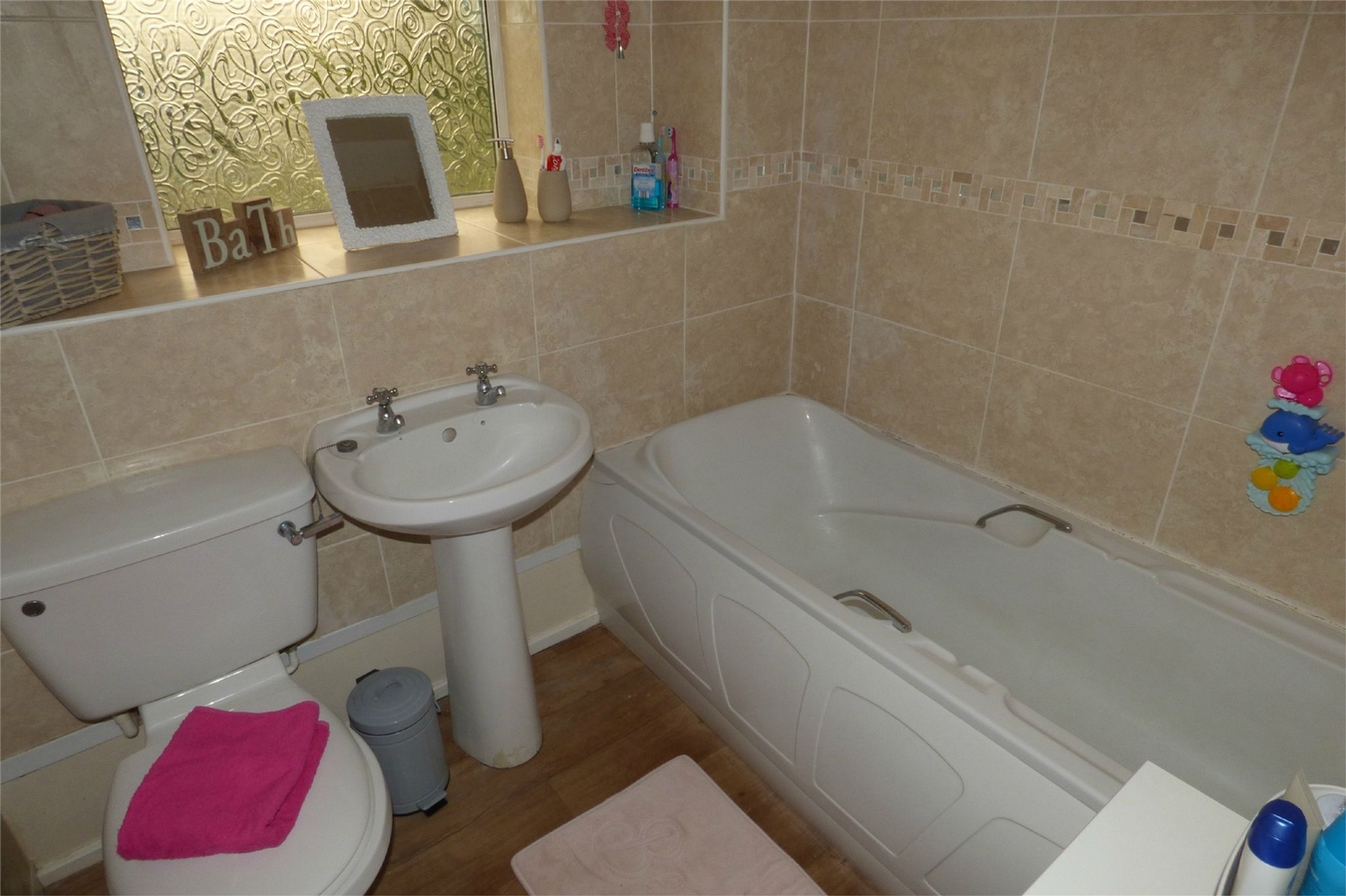 Being fully tiled to the walls and having a white suite comprising a panelled bath, pedestal wash hand basin and low level WC. Central heating radiator and upvc sealed unit double glazed window.