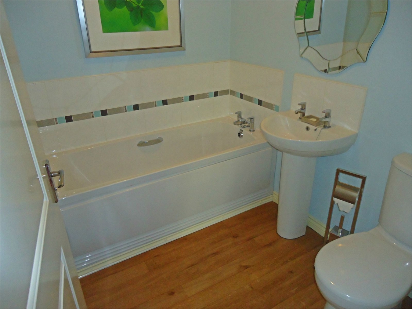 Having a modern white suite comprising a panelled bath, pedestal wash hand basin and low level WC. Central heating radiator and extractor.