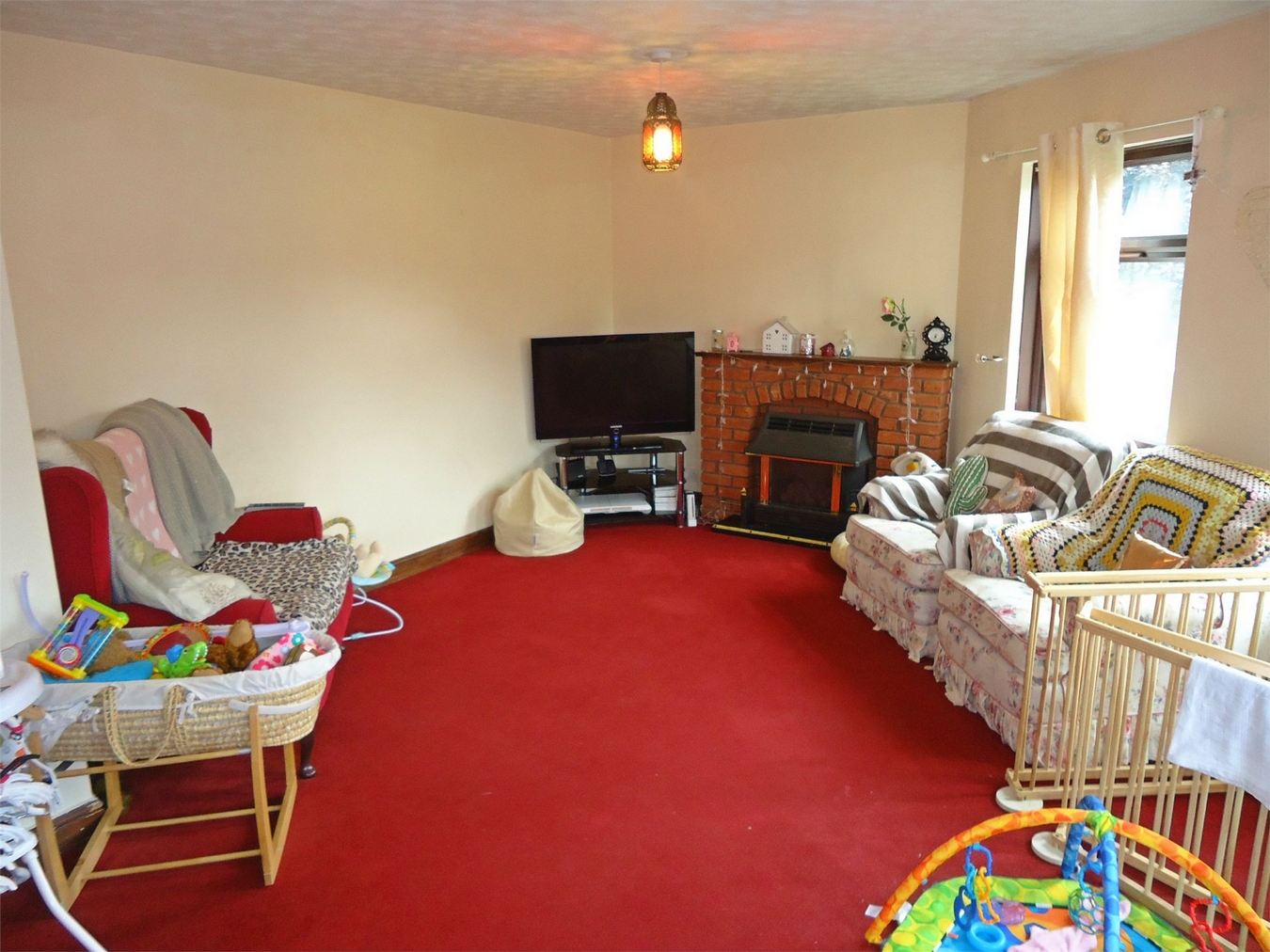 Having a gas fire, central heating radiatior, electric storage heater and four upvc sealed unit double glazed windows.