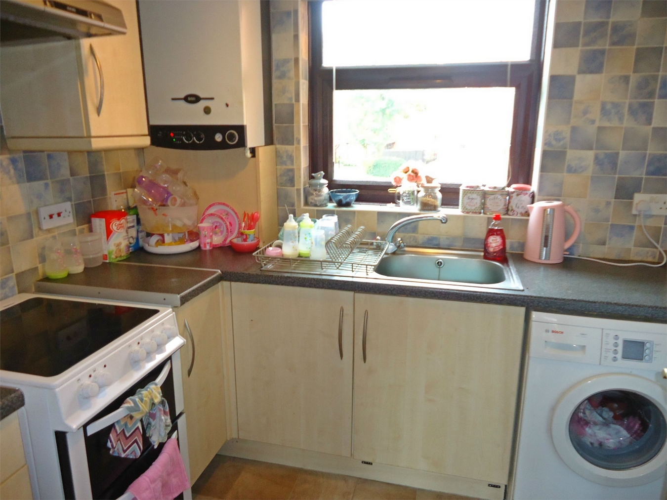 Being fully tiled to the walls and having a single drainer sink unit with mixer tap and fitted base unit, additional fitted base cupboards and drawers with work surfaces over and fitted wall cupboards, electric cooker point, plumbing for automatic washing machine, laminate flooring and upvc sealed unit double glazed window.