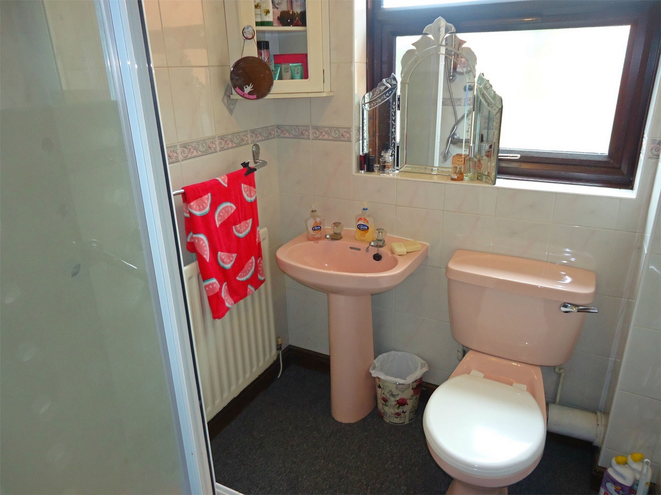 Being fully tiled to the walls and having a coloured suite comprising a pedestal wash hand basin with hot and cold taps and low level WC. Central heating radiator and upvc sealed unit double glazed window.