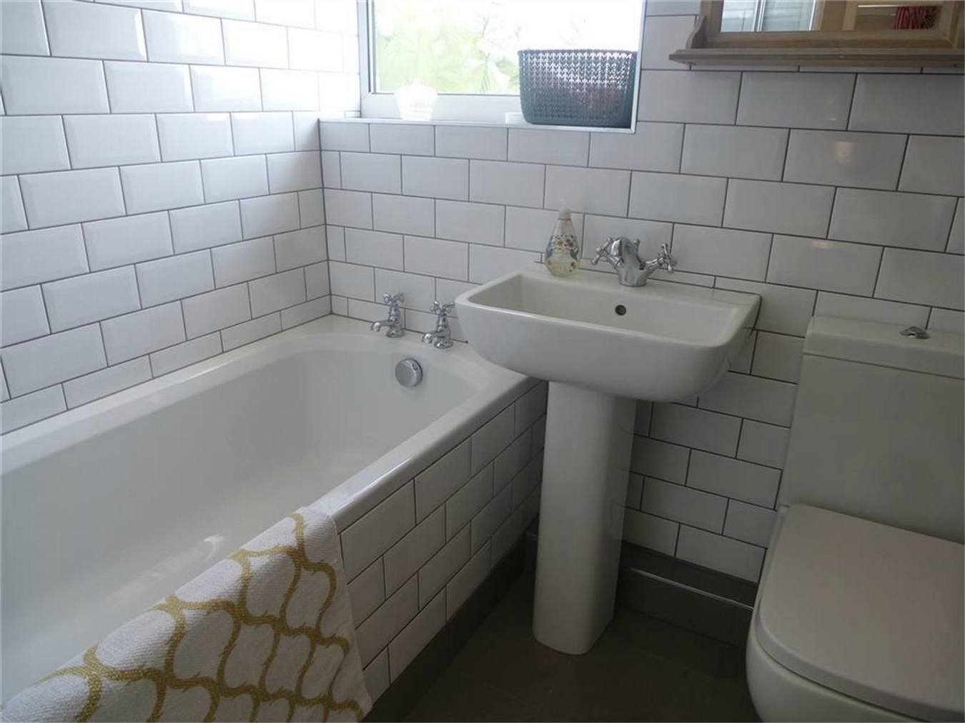 Being part tiled to the walls and having a white suite comprising a bath with shower over, pedestal wash hand basin and low level WC. Heated towel rail and upvc sealed unit double glazed window.