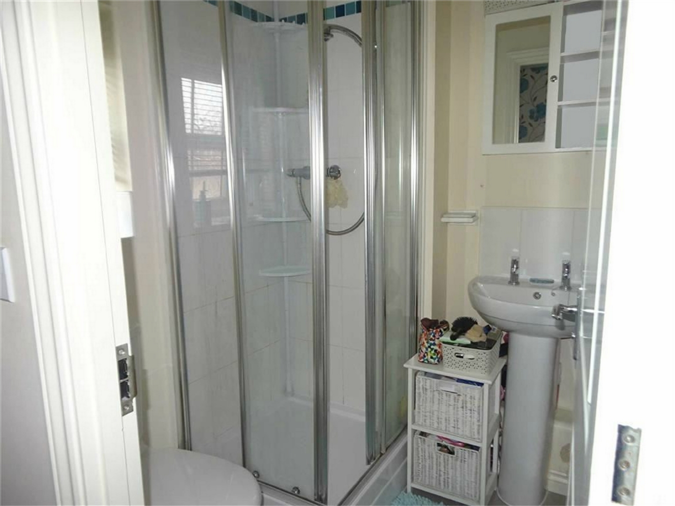 Having a white suite comprising a shower cubicle, pedestal wash hand basin and low level WC. Central heating radiator and upvc sealed unit double glazed window.