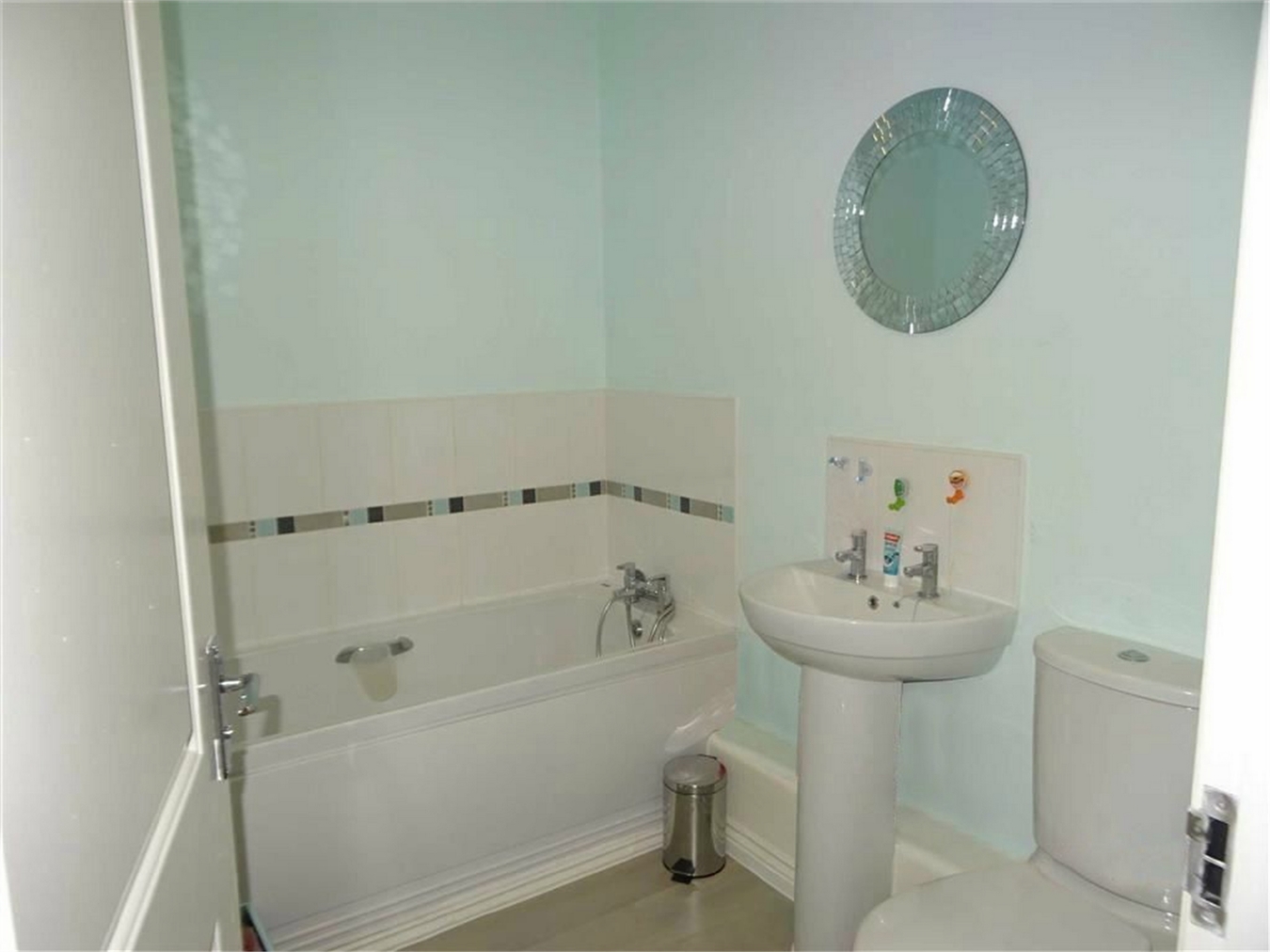 Having a white suite comprising a panelled bath with mixer tap and shower attachment, pedestal wash hand basin and low level WC. Central heating radiator and extractor.