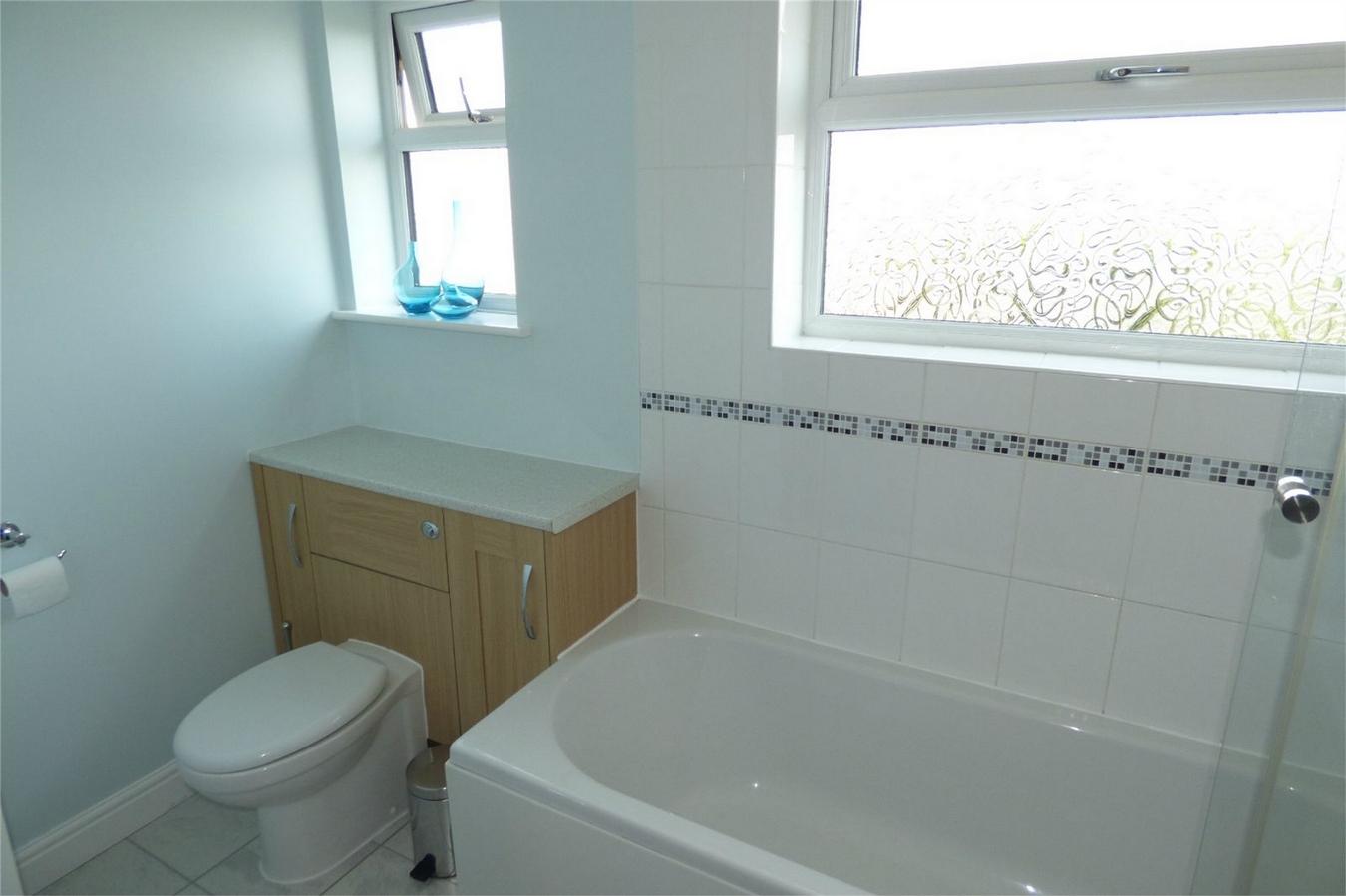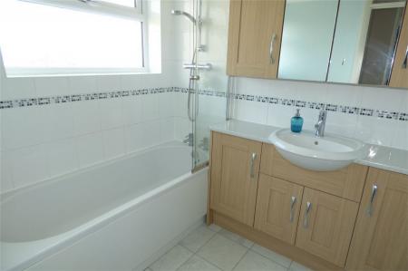Being part tiled to the walls and having a modern white suite comprising a panelled bath with shower over, wash hand basin with cupboard below and low level WC. Central heating radiator, heated towel rail and two upvc sealed unit double glazed windows.