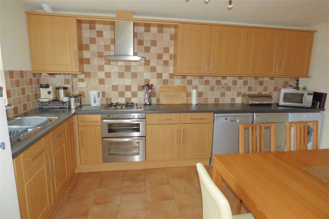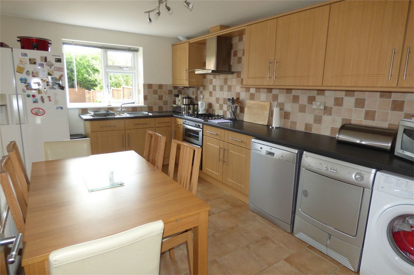 The spacious open plan family dining kitchen is a particularly attractive feature of the home, having a one and a half bowl single drainer sink with mixer tap, fitted base unit, additional base cupboards and drawers with work surfaces over and fitted wall cupboards. Built-in oven, hob and extractor hood. Plumbing for an automatic washing machine, two central heating radiators, tiled flooring, upvc sealed unit double glazed window and double doors leading to the rear garden.