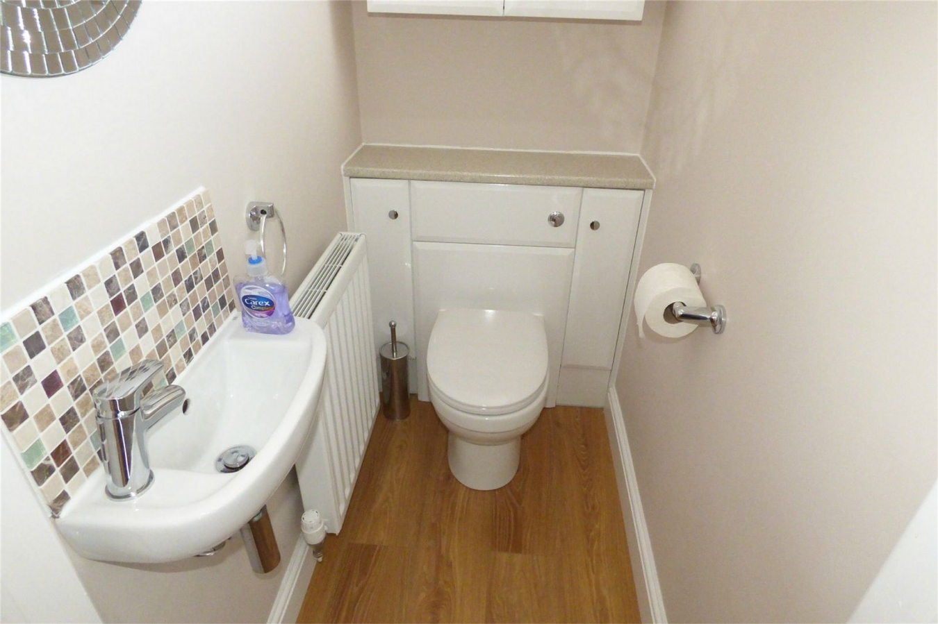 Having a white suite comprising a wash hand basin and low level WC. Central heating radiator, fitted cupboard and upvc sealed unit double glazed window.
