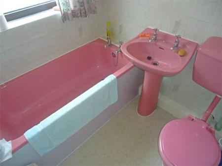 Being half tiled to the walls and having a pink coloured suite comprising a panelled bath, wash hand basin and low level WC. Dimplex wall mounted heater and sealed unit double glazed window.