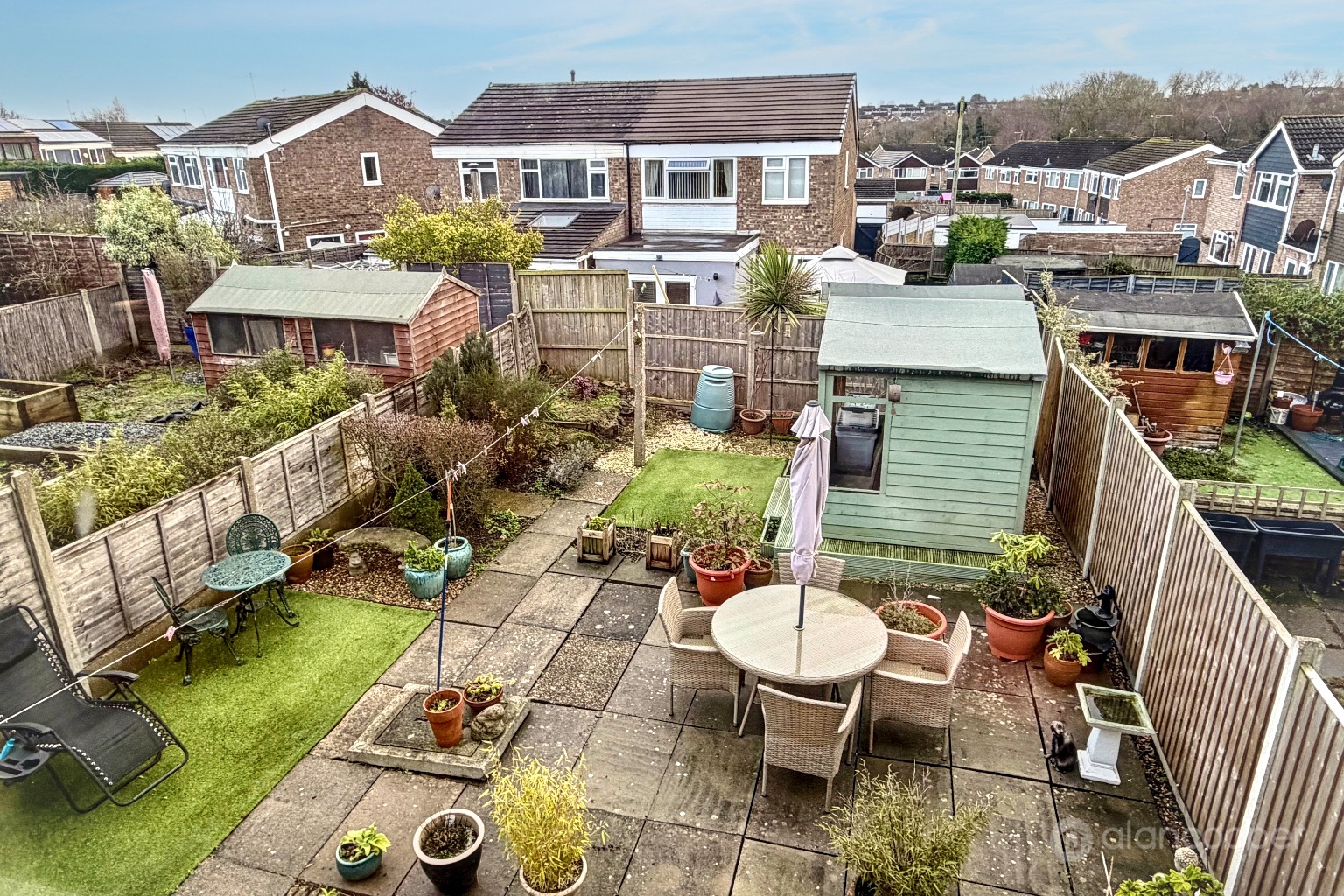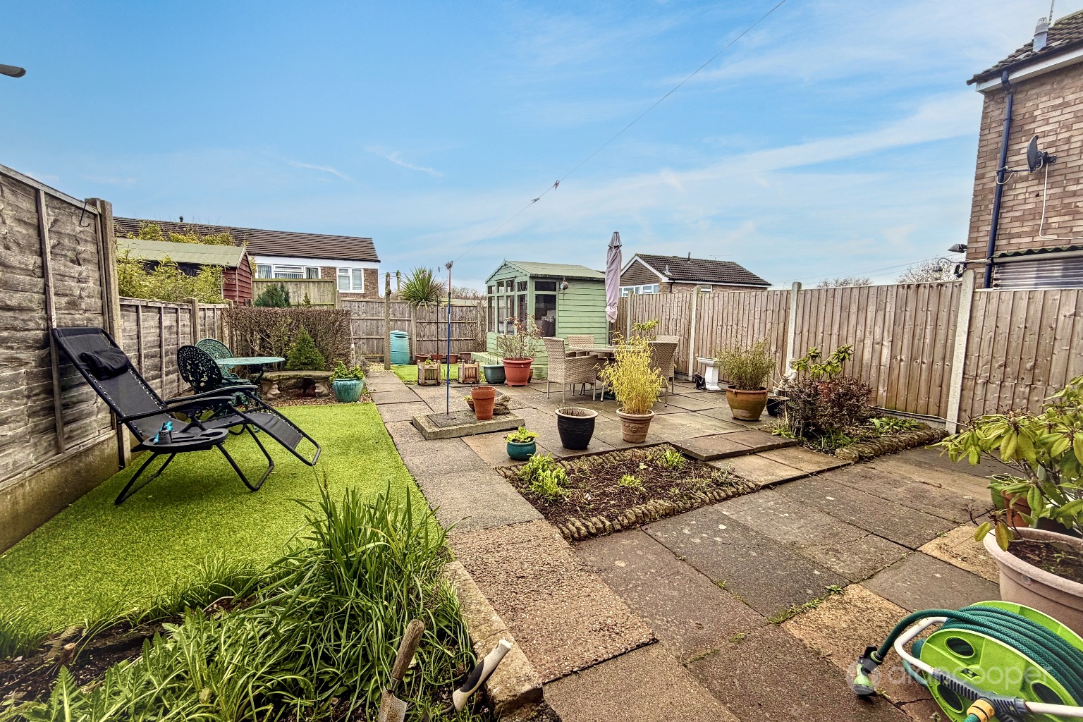 GardensThe property is set behind a lawned foregarden. The rear garden has a patio area with inset planting and an artificial lawn. Summer house.