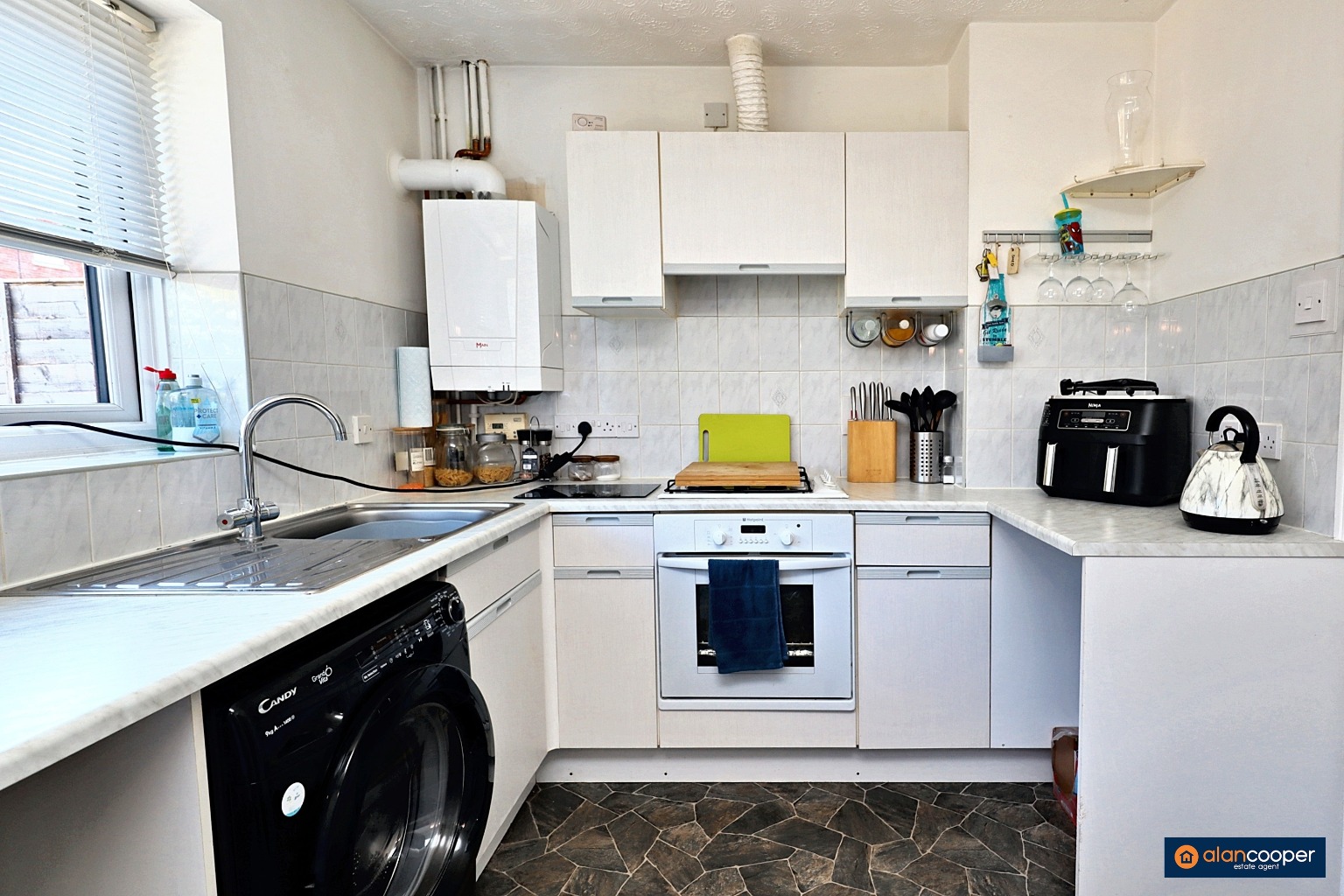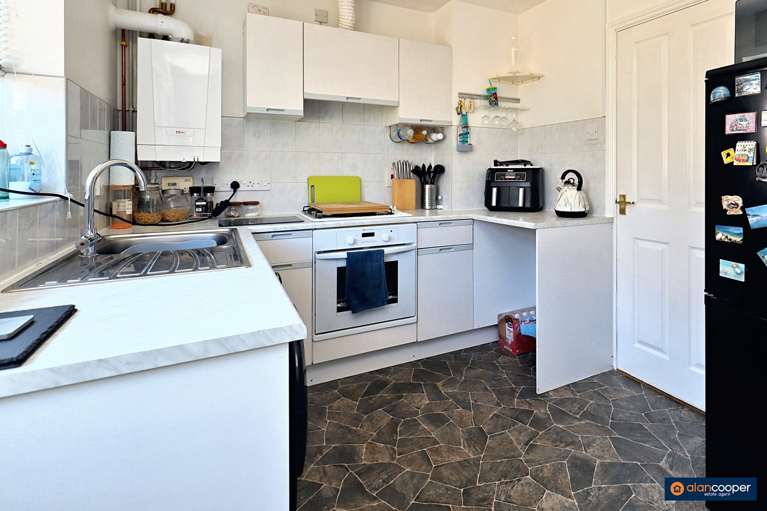 The dining kitchen features a built-in oven and hob, it caters to both culinary enthusiasts and casual home cooks. The window overlooking the garden provides a calming view while you prepare meals, and the door to the rear offers easy access to the outside space.