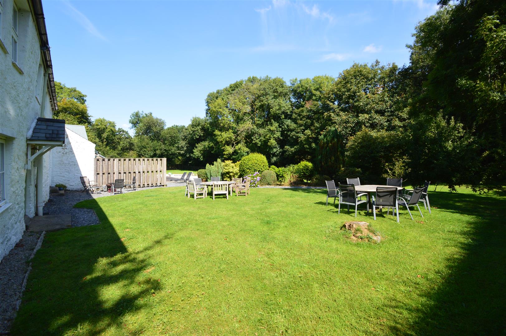 Steps lead down to the large level lawn with croquet area. Neighbouring and beyond the garden is a deciduous woodland with a stream running through the famous Lydford Gorge.