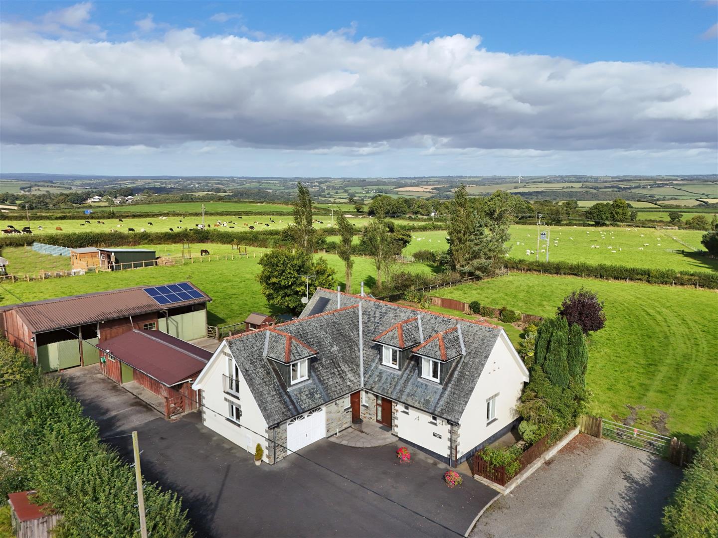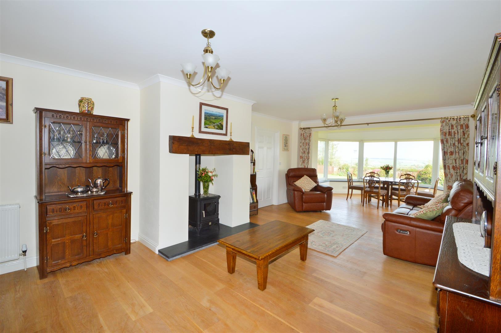 The house is well presented and offers comfortable and spacious family living. The spacious accommodation benefits from oil fired central heating, double glazed windows and doors. The accommodation briefly comprises: Solid hardwood door opens to; Entrance Hall; Solid wood flooring, alcove, staircase to the first floor with understairs storage. Sitting room; Wood flooring, inglenook style fireplace with oak lintel, slate hearth and oil fired wood burner effect stove, window to the front and opening to; Sun room; dwarf walls, uPVC double glazed windows and door to the garden, far reaching panoramic views. Kitchen / Dining Room; a dual aspect room enjoying panoramic views across the garden. Oil fired Aga with extractor hood, integrated electric double oven with four ring cooker. Fitted wall and base units under black granite effect worksurfaces, stainless steel sink. Utility / Boot Room; tiled floor, fitted larder and base units, Butler's sink, space and plumbing for washing machine. Wood door to the front and uPVC double glazed door to the rear and a connecting door to the garage. Cloakroom; Tiled floor, w/c and wash handbasin. Bedroom 1; a dual aspect room with far reaching panoramic views. En suite Bathroom; Shower, bath, w/c, wash hand basin, tiled floor, heated towel rail. On the First Floor: Large landing; window to the front and Velux to the rear enjoying far reaching views, airing cupboard. Bedroom 3; a dual aspect room with windows to the front and rear, built in wardrobe and eaves storage cupboard. En suite shower room; Wash hand basin, w/c and shower, tiled floor and heated towel rail. Bedroom 2; a dual aspect room, enjoying panoramic views. En suite; Corner shower, w/c, wash hand basin, tiled floor, heated towel rail and Velux with far reaching views. Bedroom 4; a dual aspect room with French doors and Juliette balcony to the side, fitted wardrobe and eaves storage cupboards. Cloak Room; wash hand basin, w/c, tiled floor and Velux window with panoramic views.