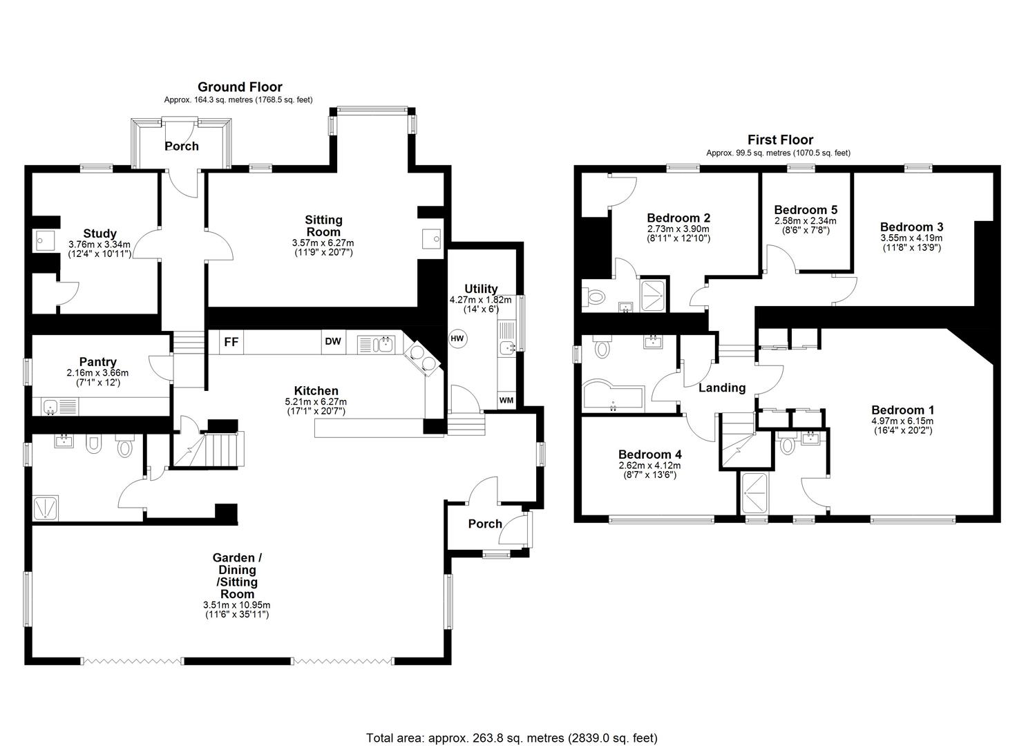 On the First Floor; Split level landing, airing cupboard. Fitted wardrobes window to the front enjoying far reaching views. Ensuite; shower enclosure with fully tiled walls, vanity unit with wash hand basin and w/c. Bedroom 4 / Study; a double room with window to the rear. Family Bathroom; 'P' shaped bath with shower above, w/c, vanity unit with wash basin, heated towel rail, airing cupboard. Bedroom 2; double room, exposed beams, window to the front, En suite; fully tiled shower enclosure, vanity unit, wash basin, w/c. Bedroom 5; a single / bunk room window to the front. Bedroom 3; a double room, exposed beams, window to the front.