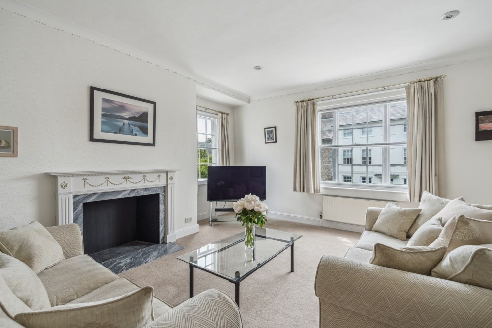 The main building exudes character with its grand entrance door, leading into a meticulously maintained communal hall. Ascend the stairs to the first floor, where a stylish glass-panelled door opens into a bright and welcoming hallway. The modern kitchen is well-appointed with plentiful wall and floor cupboards, providing generous storage. It features a sleek Bosch induction hob with an oven beneath, a black glass splashback, and an extractor fan. The stainless steel 1½ bowl sink, Bosch washing machine, and Liebherr fridge freezer complete the functional yet stylish space. To the right of the hallway you are greeted by a spacious, light-filled dual-aspect lounge. This airy living area boasts picturesque views, a charming fireplace with a marble surround and hearth, perfect for cozying up on cooler evenings. Additional features include an airing cupboard housing the water tank