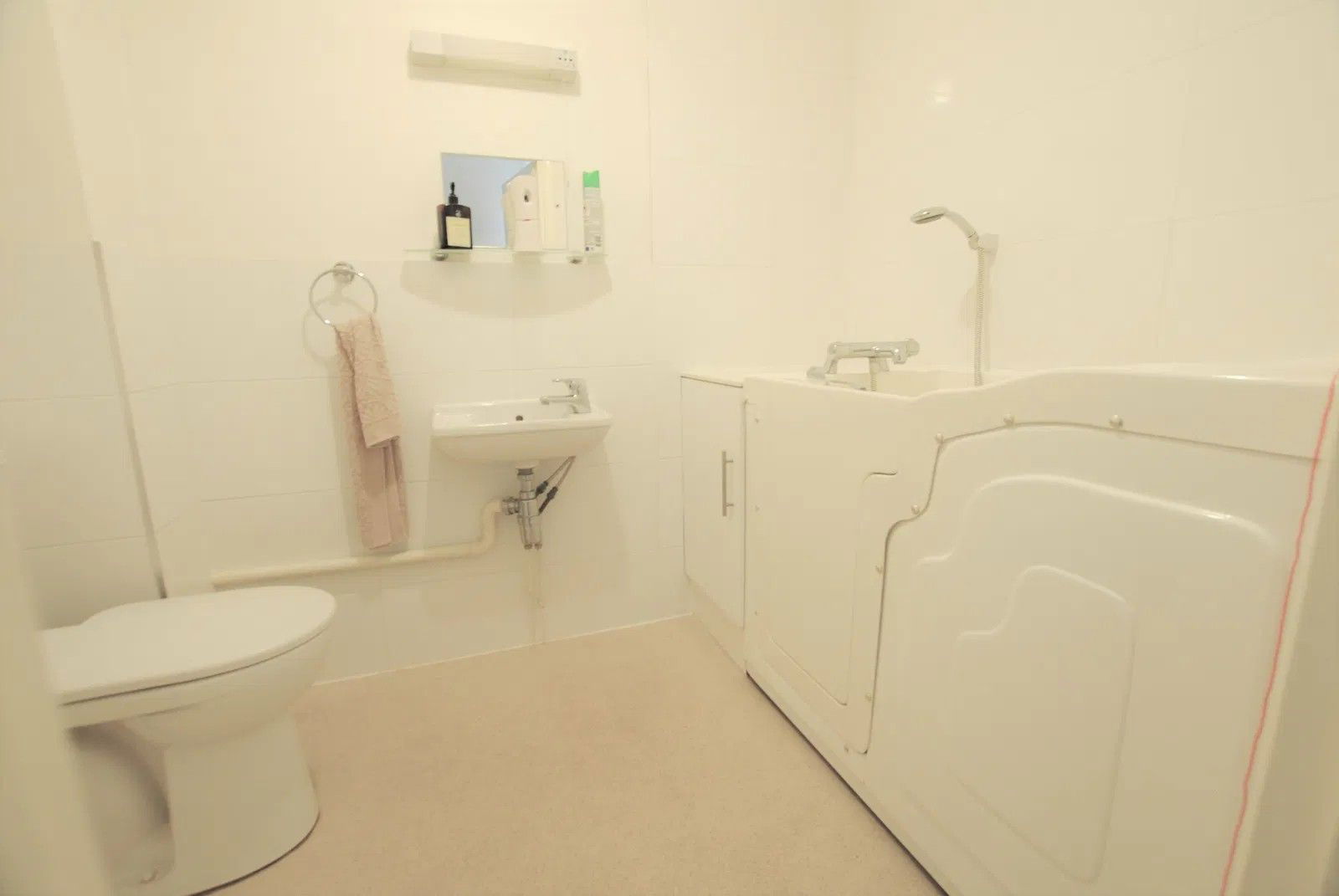 BATHROOM white suite with low level W.C., wall mounted sink with single mixer tap, adapted bath with mixer tap and shower attachment, extractor fan, part tiled walls, radiator.