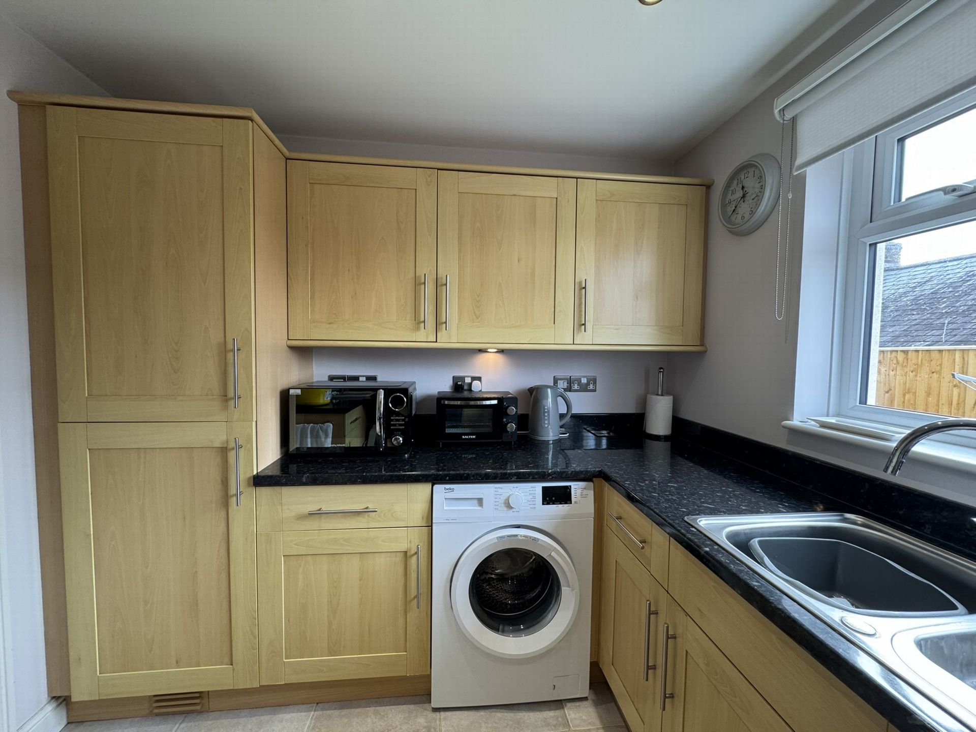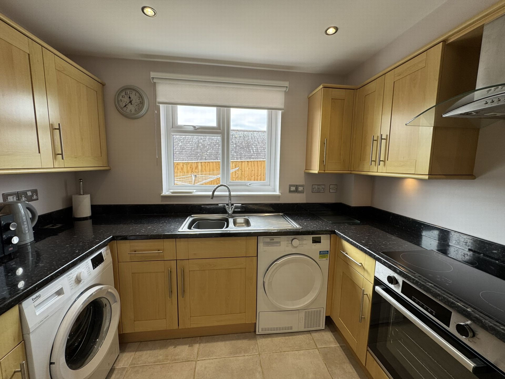 KITCHEN: 2.87m x 2.53m (9'5" x 8'4"), Fitted with a modern range of cupboard and drawer base and wall units with roll edge works surfaces and inset one and a half bowl single drainer stainless steel sink unit. Built in electric oven with induction hob and extractor hood above, integrated fridge freezer, plumbing for a washer/dryer and dishwasher. Tiled flooring, double glazed window to the rear aspect.