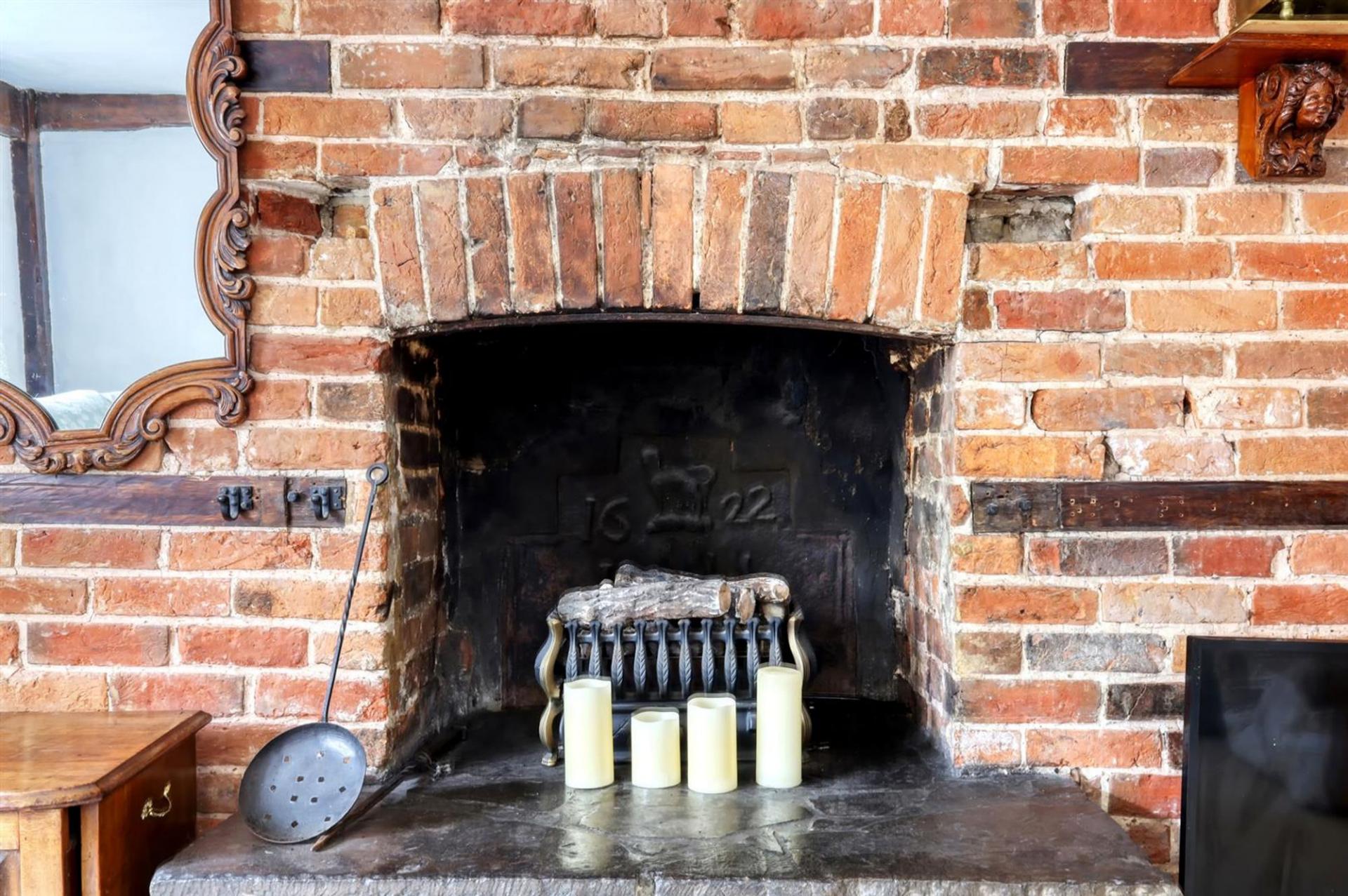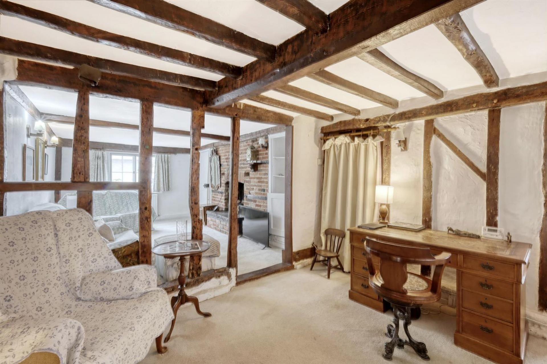 The ground floor welcomes you with a spacious living room featuring a striking character fireplace. This inviting space flows effortlessly into a second reception room, currently used as a study,subtly divided by original beams that showcase the home’s historic charm. A separate dining room with its own period fireplace and pantry cupboard offers a cosy setting for family meals and entertaining.