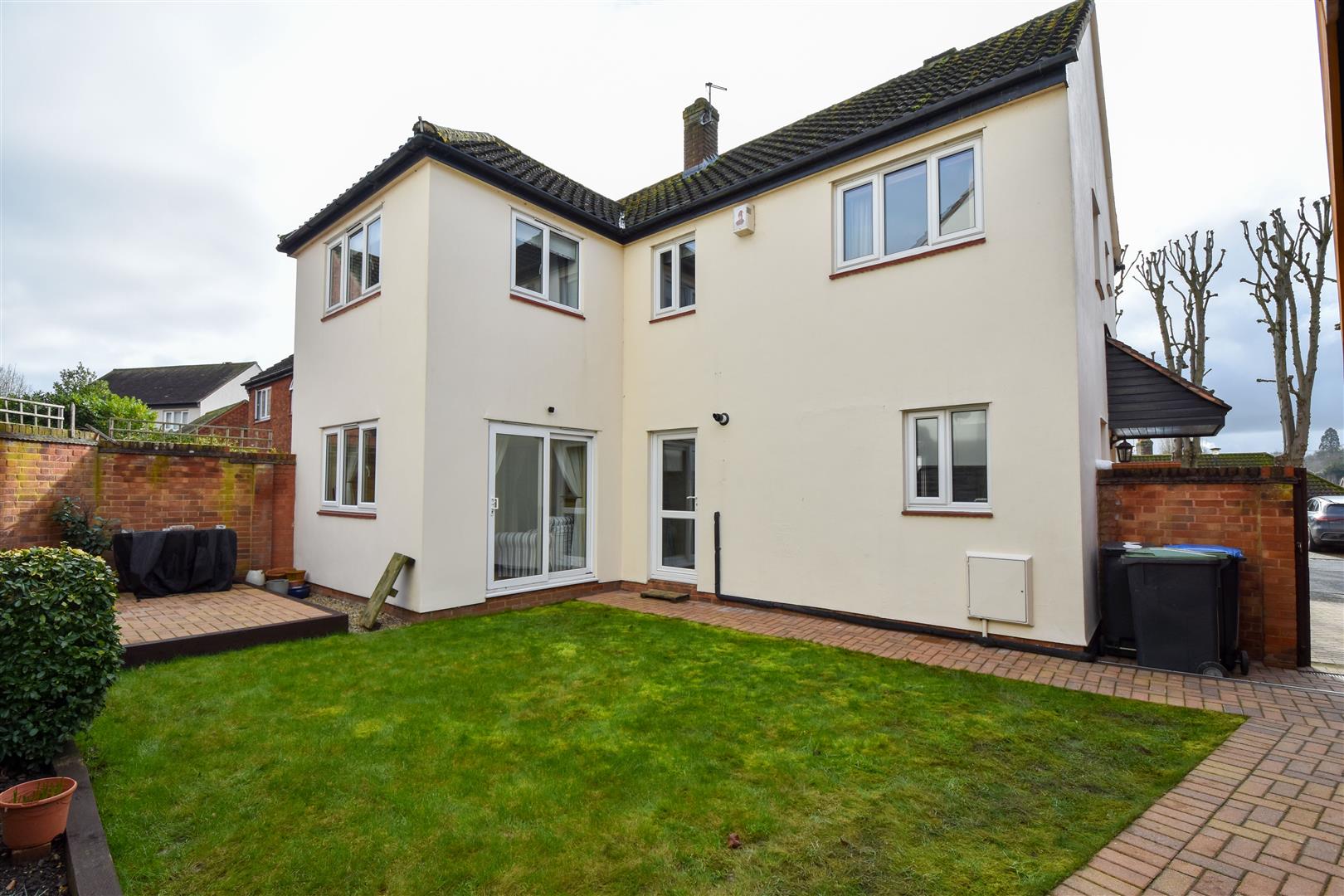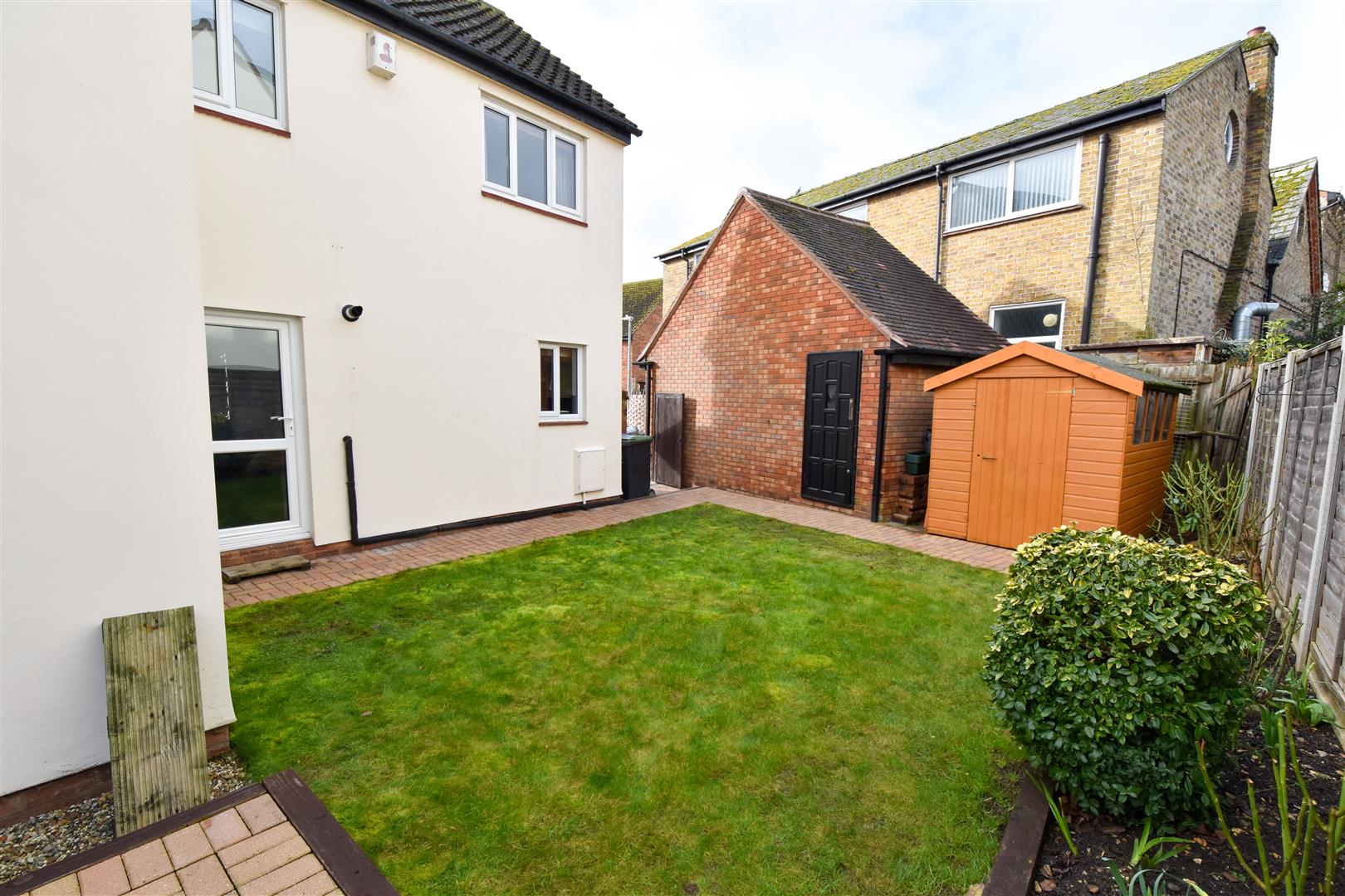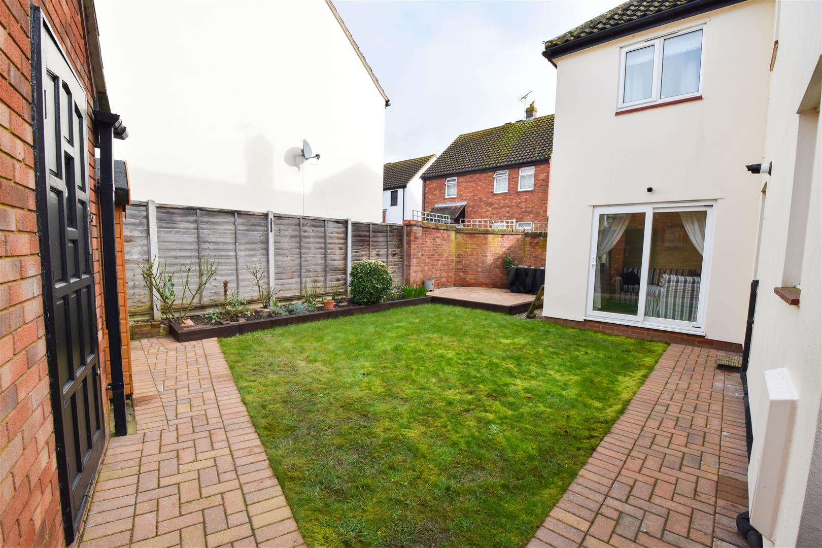 Exterior - Rear Garden - Side access. Door into garage/playroom. Brick paved pathway surrounding the lawn and there is a brick paved patio area. Sleeper edged flower beds.