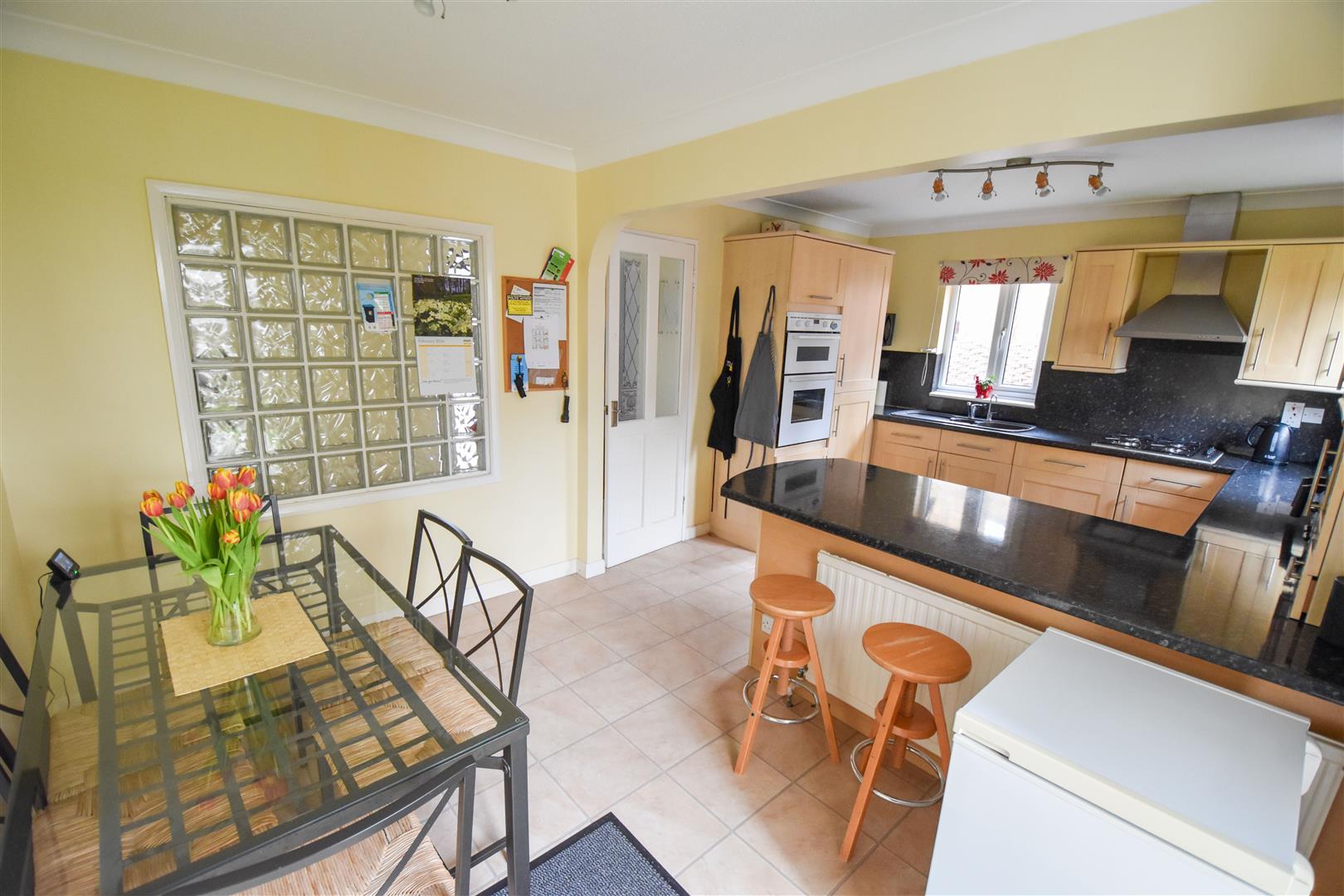 Kitchen / Dining Room - 5.31m x 3.35m (17'5 x 11') - Windows to front and side aspects and feature, glass block borrowed light window to hallway. Kitchen is fitted in a range of modern wall and base units with contrasting work surface over. Integrated appliances include double oven and fridge/freezer and there is ample space for further appliances. Door to rear garden.