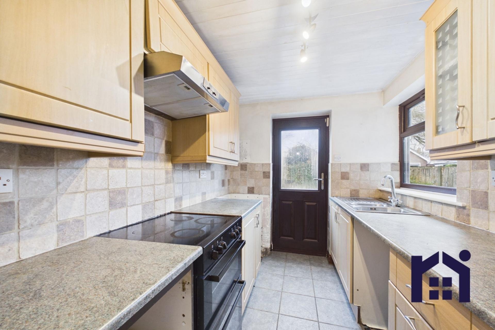 The home benefits from driveway parking for two vehicles, a single garage, and a spacious entrance porch leading into a welcoming hallway. The ground floor features a bright and airy reception room with a charming bay window and electric fire, creating a cosy focal point. The galley kitchen provides space for a range of wall and base units, an oven and extractor, along with plumbing for a washing machine and additional space for a dryer.