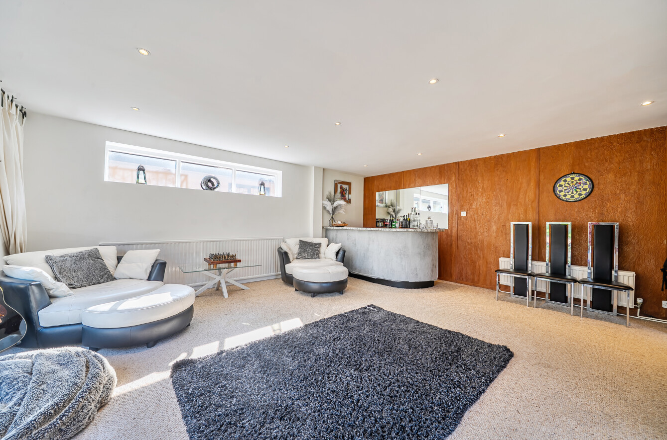 The ground floor offers spacious accommodation all leading off an inviting central entrance hall with a two piece downstairs cloakroom. There is an elegant double aspect living/dining room with a feature fireplace, separate office and a large entertainment room with doors opening out to the rear garden. The kitchen comprises a range of wall and base units with space for appliances and a breakfast table and chairs.