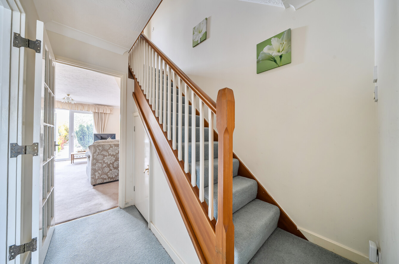 The front door opens into an inviting entrance hall with a two piece downstairs cloakroom. To the front is the kitchen with a good range of fitted wall and base units with space for appliances. To the rear is a spacious living room with double doors leading out to the rear garden.
