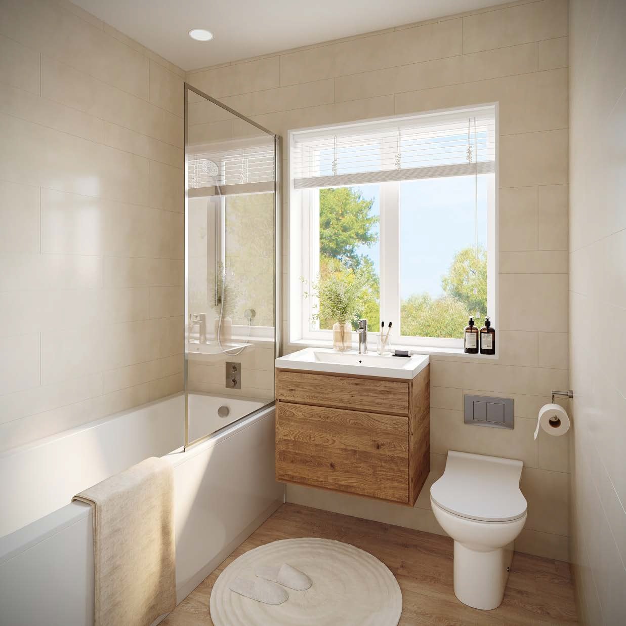 The superb kitchens feature Stoneham cabinets with natural stone work surfaces and Neff appliances, including an induction hob with extractor above, single or double oven, dishwasher, fridge/freezer, and washing machine. The sink is undermounted and has a chrome mixer tap. Aligning with the ethos of the scheme, Stoneham focus on ecological sustainability and long-lasting quality committing to planting 2000 trees over a year to re-establish lost woodlands in Europe and benefits from the Royal Warrant by appointment of the King.
