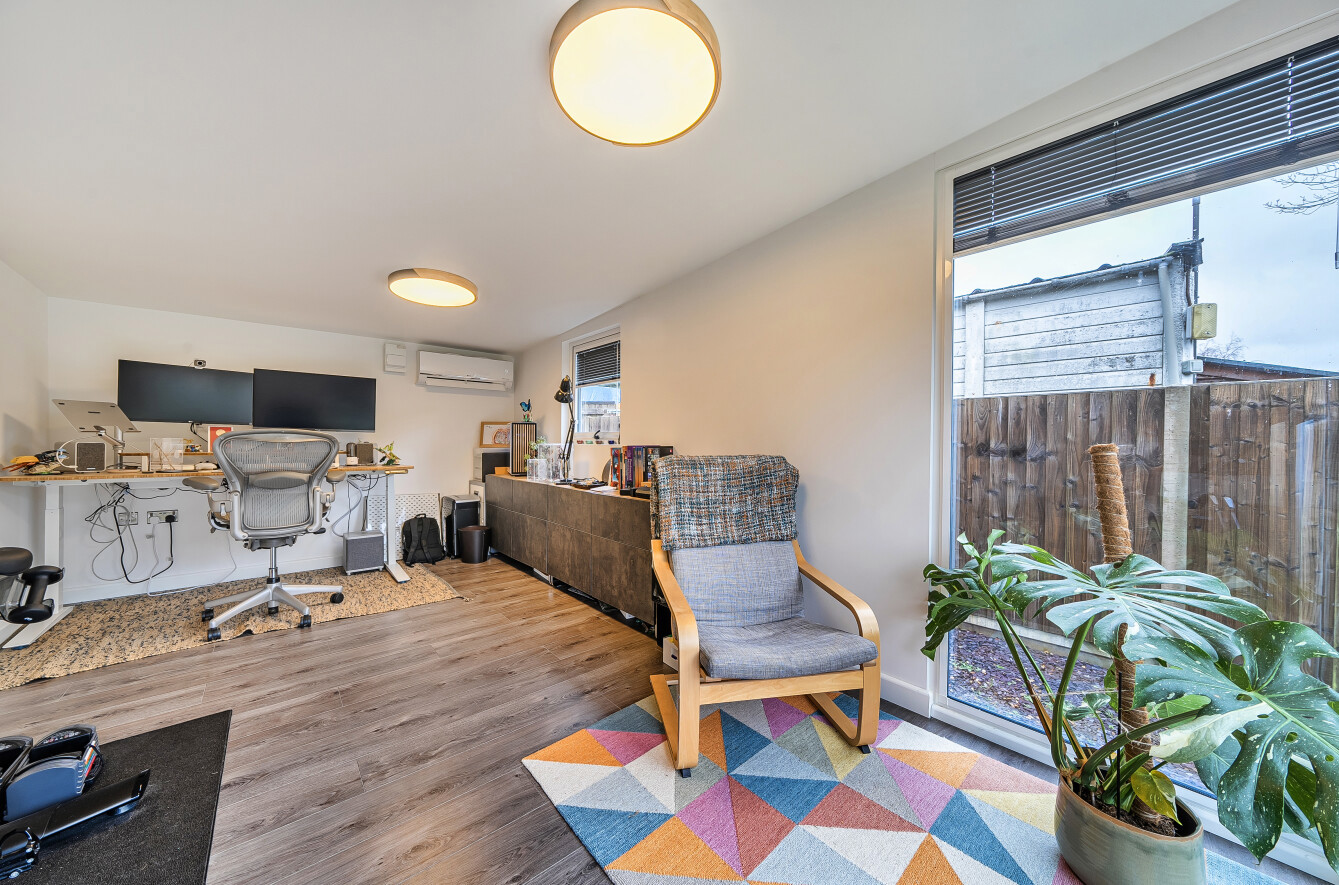 Externally and to the rear, is a substantial garden measuring approx. 110 ft., mainly laid to lawn, with a patio area offering an ideal space for outdoor relaxation and entertaining. To the rear of the garden is a studio, ideal for an office/gym with air-conditioning/heating. There is also a shed, ideal for storage, and garage with rear access. To the front of the property is a driveway providing convenient off-street parking.