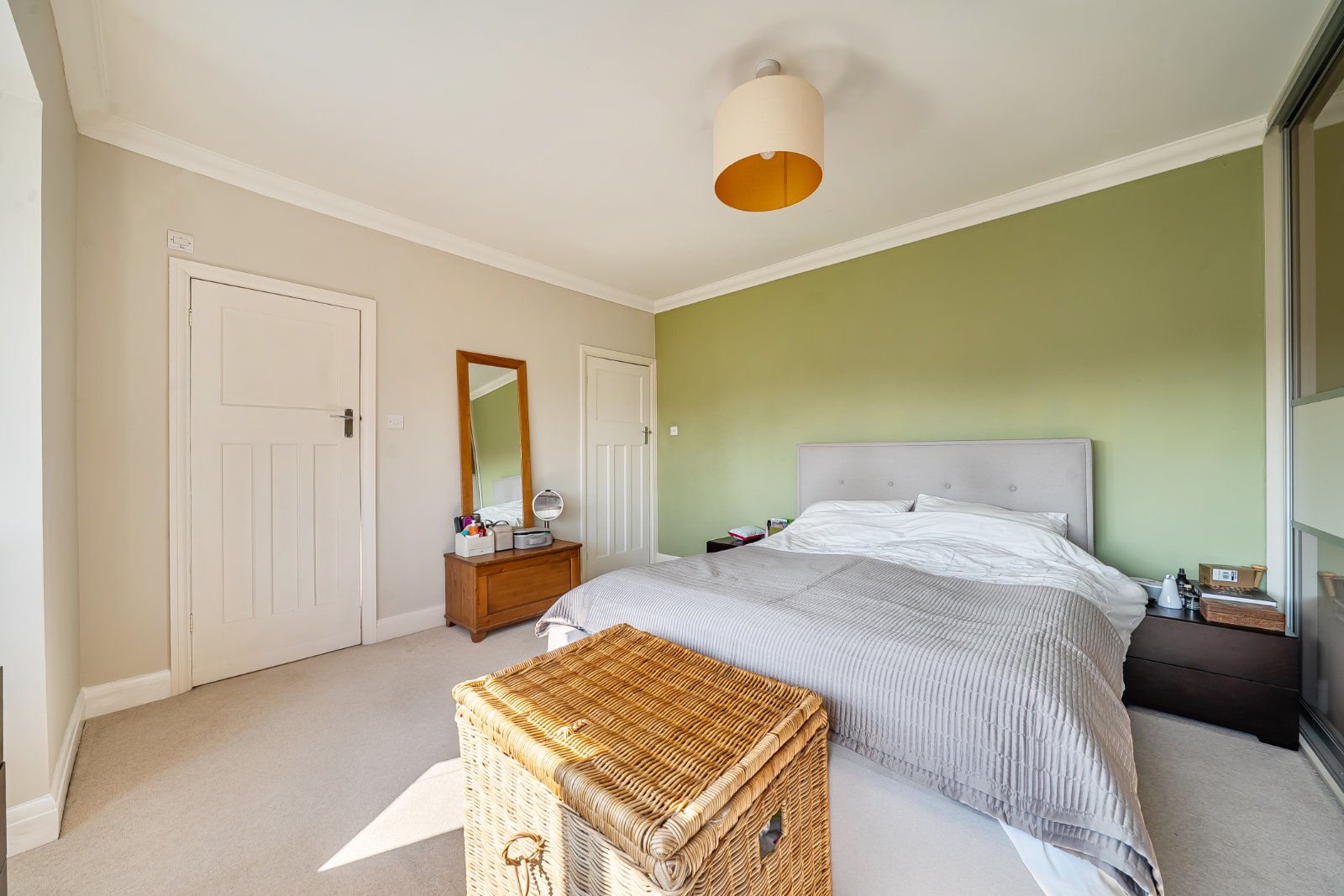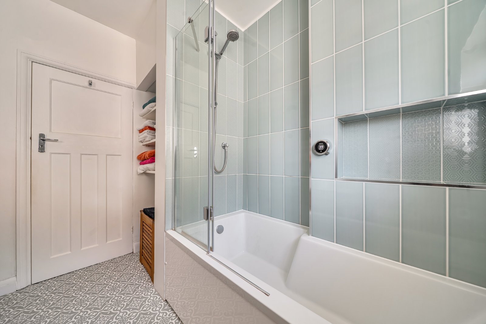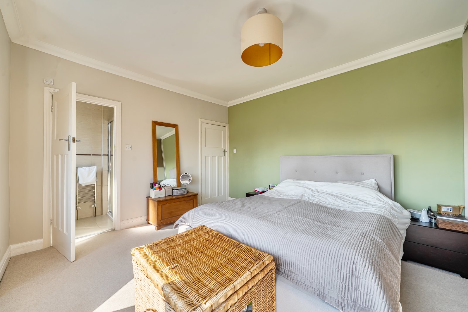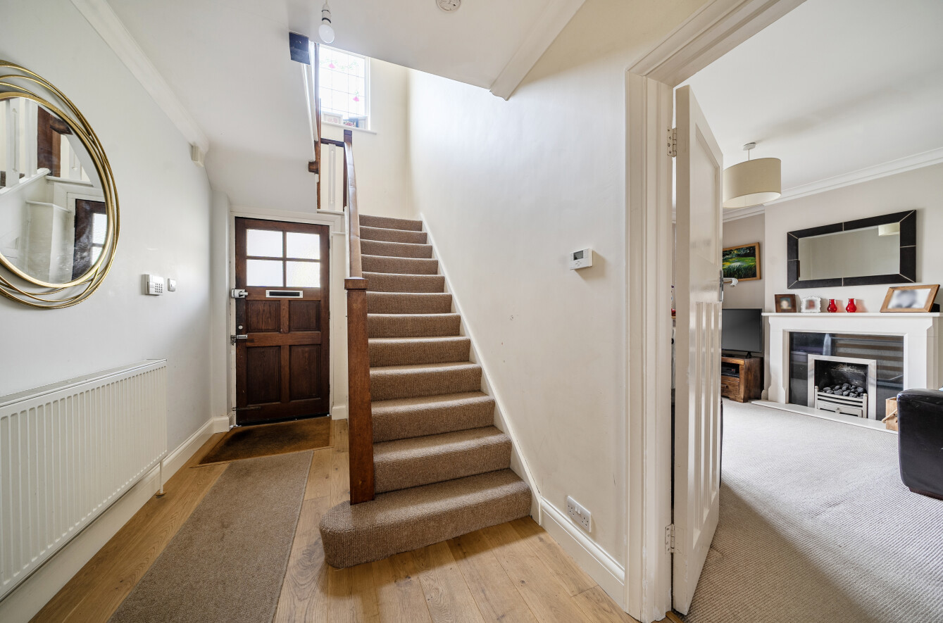 Upstairs, a beautiful stained-glass window lights the staircase and landing. There are three double bedrooms, including a generous master suite with fitted wardrobes and contemporary en-suite, plus a fourth bedroom that can serve as a study. A recently renovated family bathroom with underfloor heating and high-spec Aqualisa shower completes the first floor.