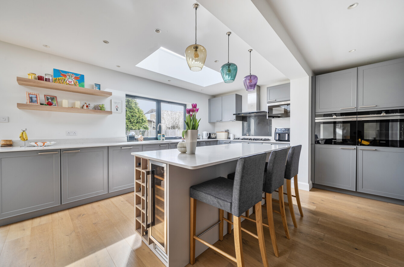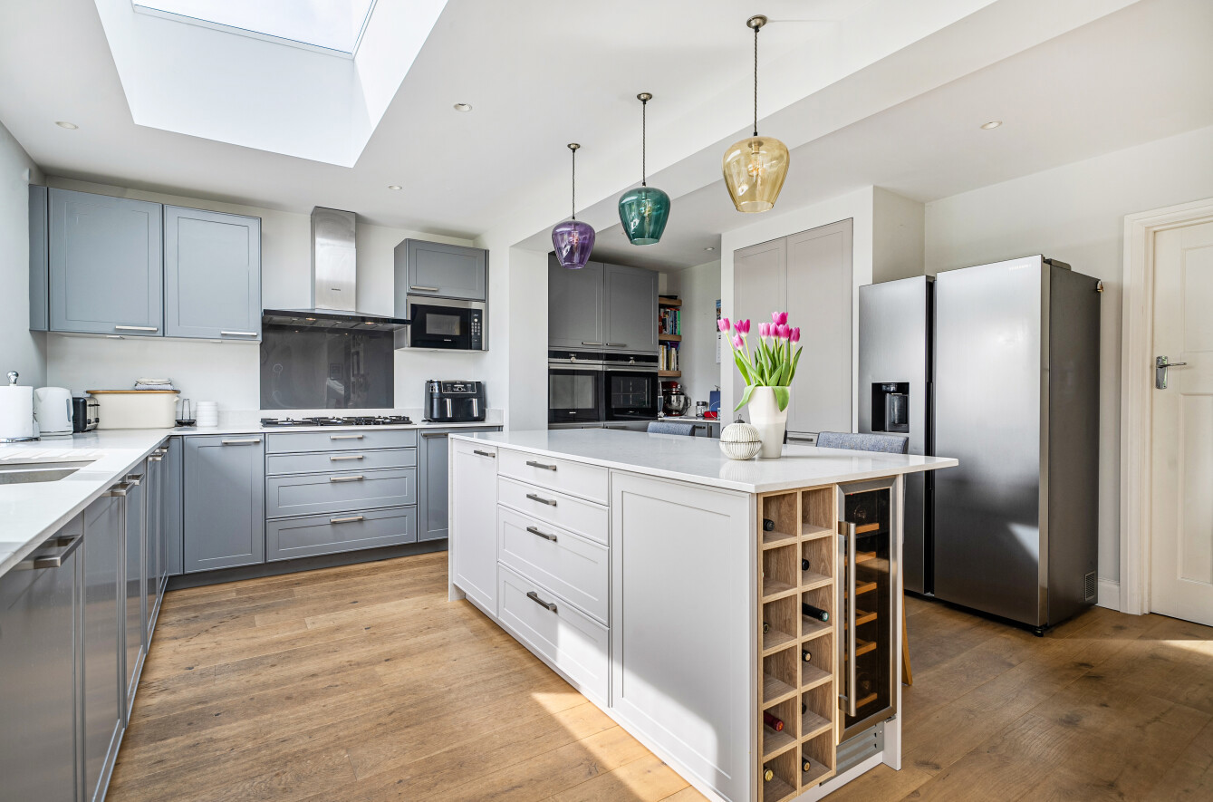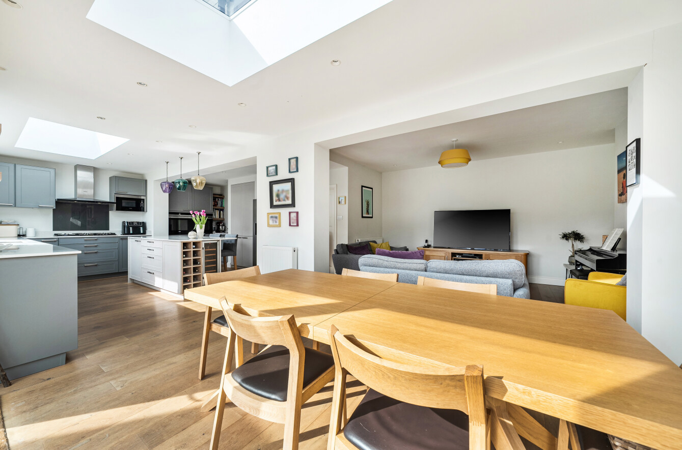 The heart of the home is the stunning open-plan kitchen, dining and family area - a seamless, light-filled space featuring a bespoke German Leicht kitchen with integrated appliances, Silestone quartz island and breakfast bar, and ample storage. Skylights and bi-fold doors flood the room with natural light and open directly onto the sunny south-facing garden and patio, perfect for alfresco dining.