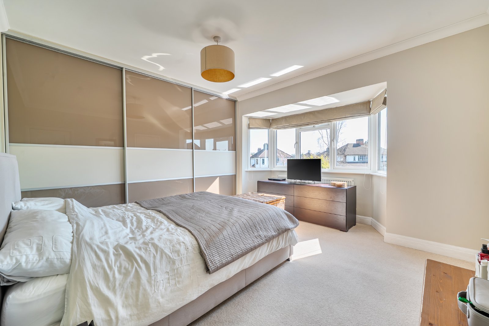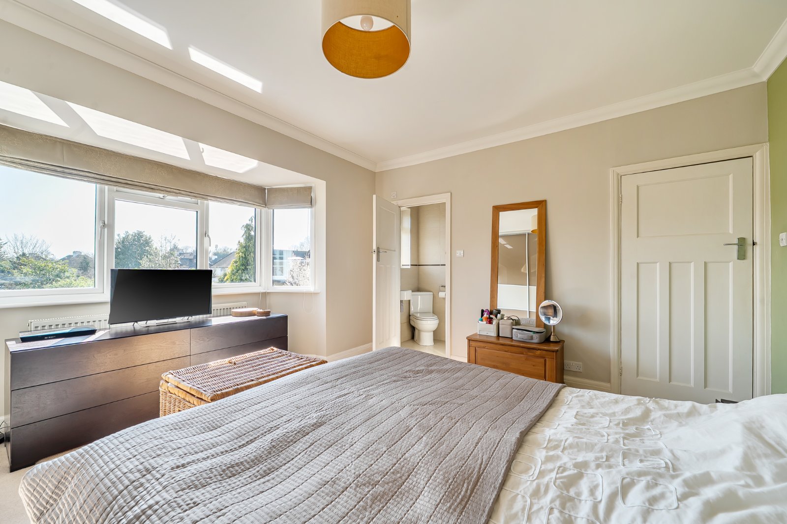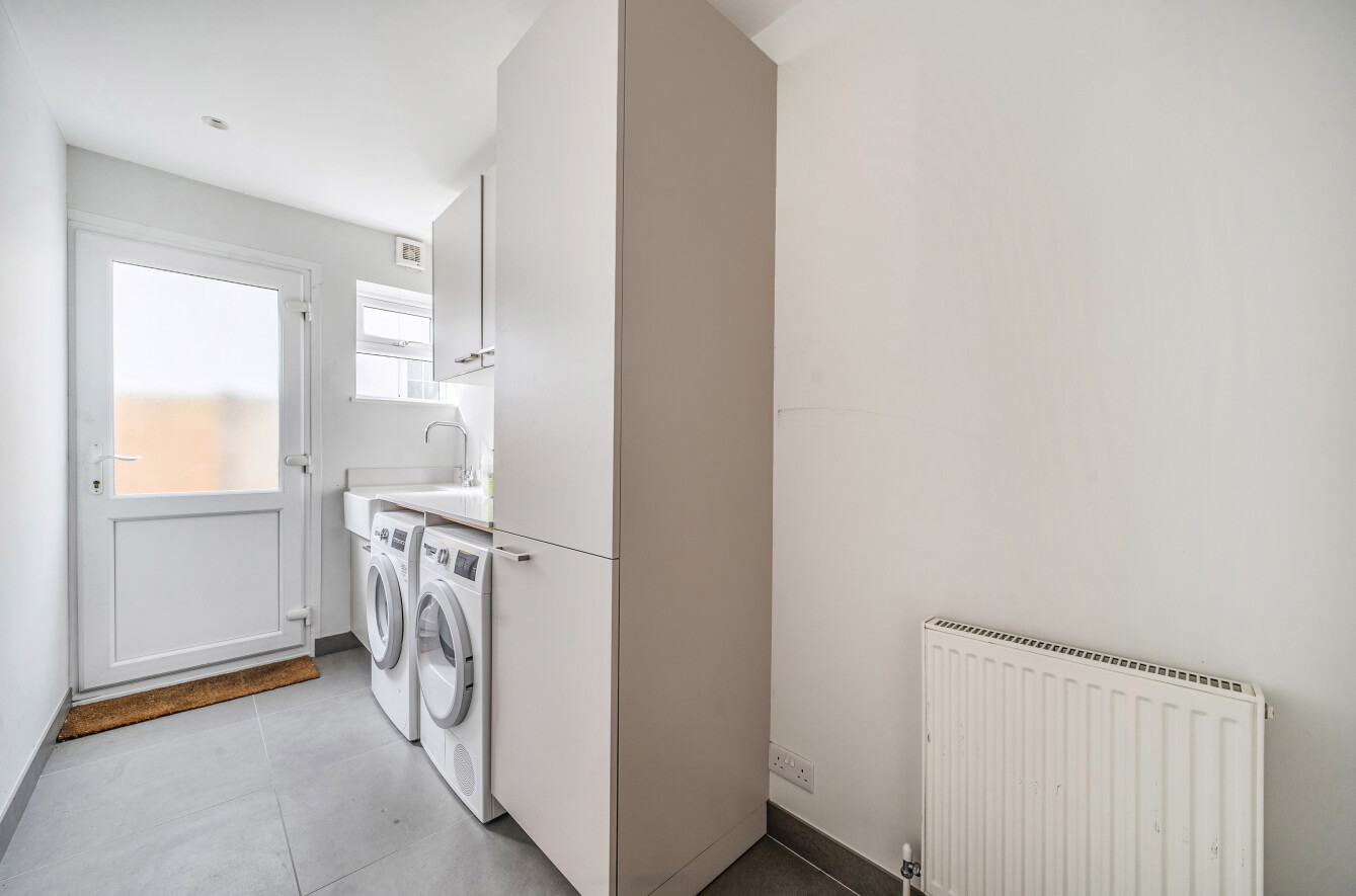 The heart of the home is the stunning open-plan kitchen, dining and family area - a seamless, light-filled space featuring a bespoke German Leicht kitchen with integrated appliances, Silestone quartz island and breakfast bar, and ample storage. Skylights and bi-fold doors flood the room with natural light and open directly onto the sunny south-facing garden and patio, perfect for alfresco dining.