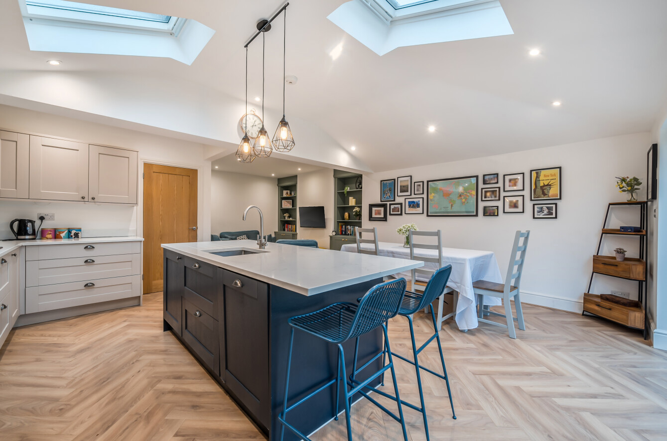 To the ground floor the property comprises a good size living room with built-in storage, a utility and wc, and a modern open plan kitchen/family room with bi-fold doors, vaulted ceiling and an island. The ground floor further benefits from herringbone flooring.