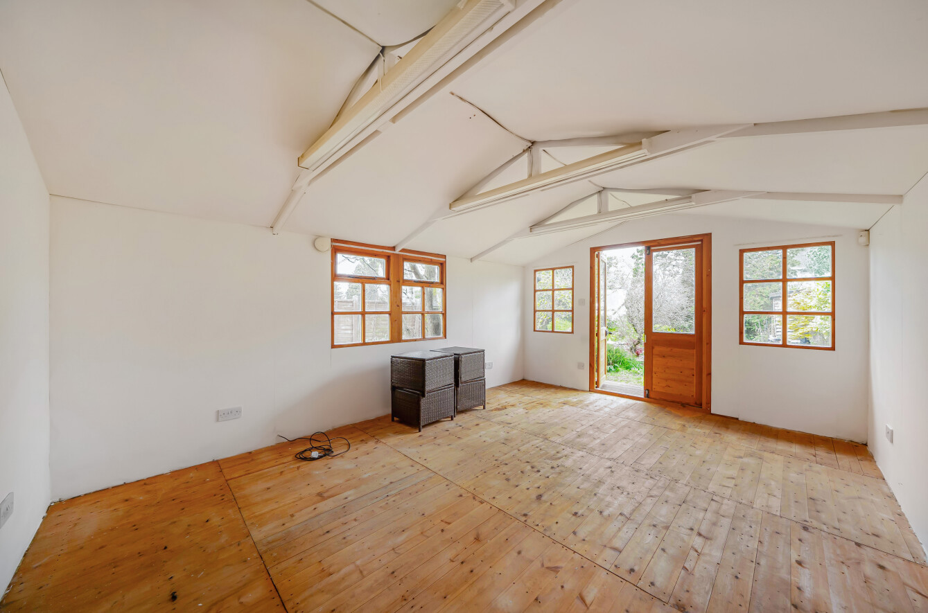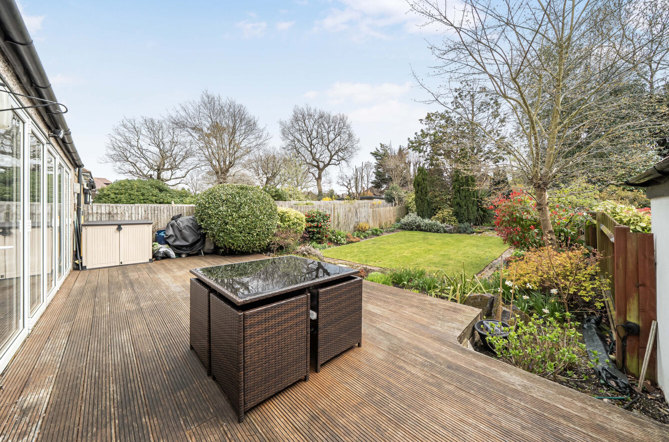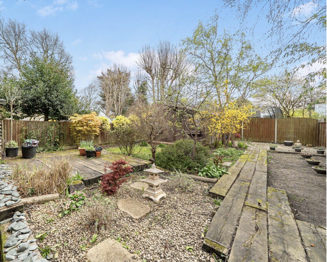 Externally, the property continues to impress. The South facing rear garden is a particular highlight, featuring attractive flower, tree, and shrub borders, a water feature, and a substantial outbuilding with power and lighting, offering versatile use. A spacious decked patio area provides the perfect setting for outdoor dining, relaxation, and entertaining.