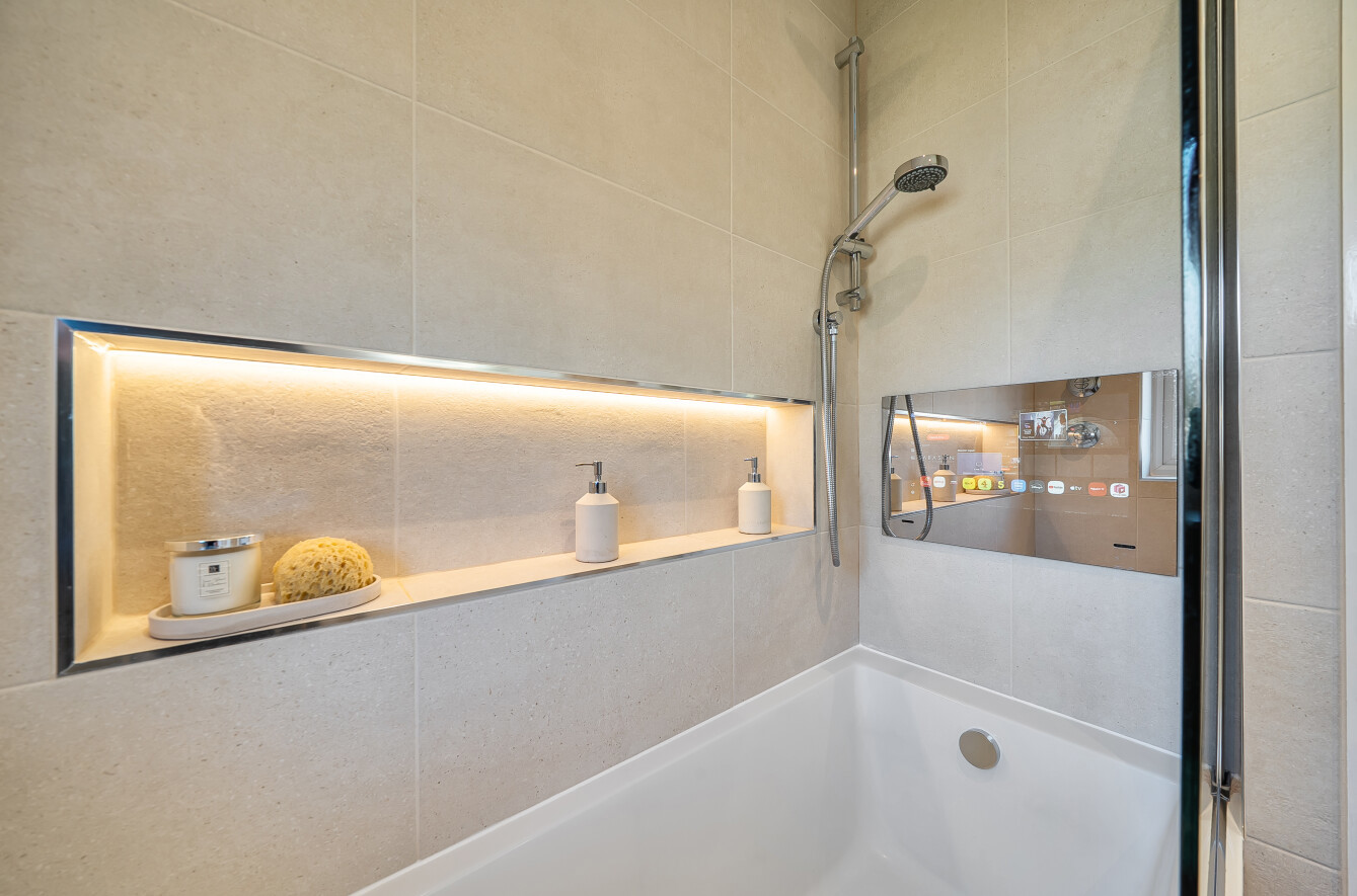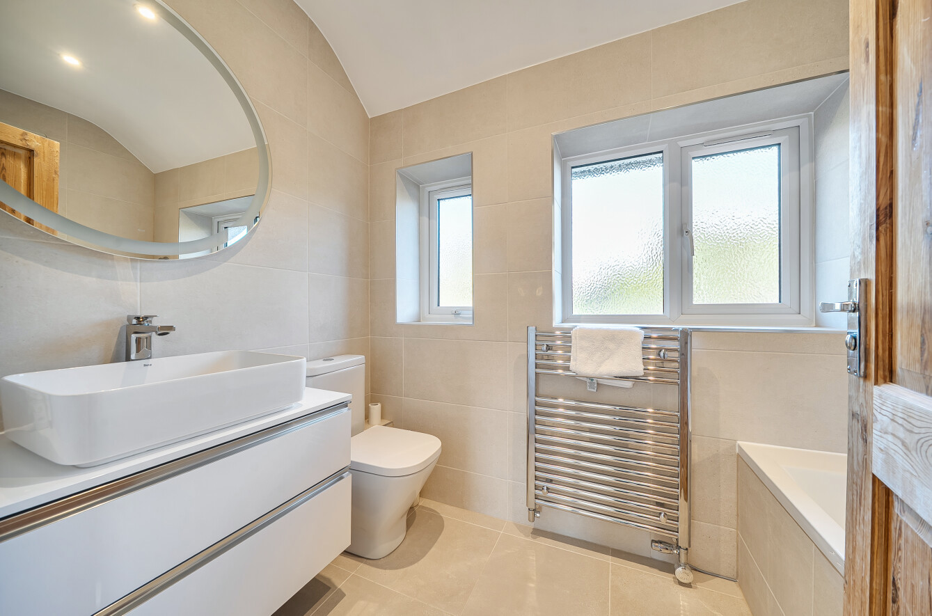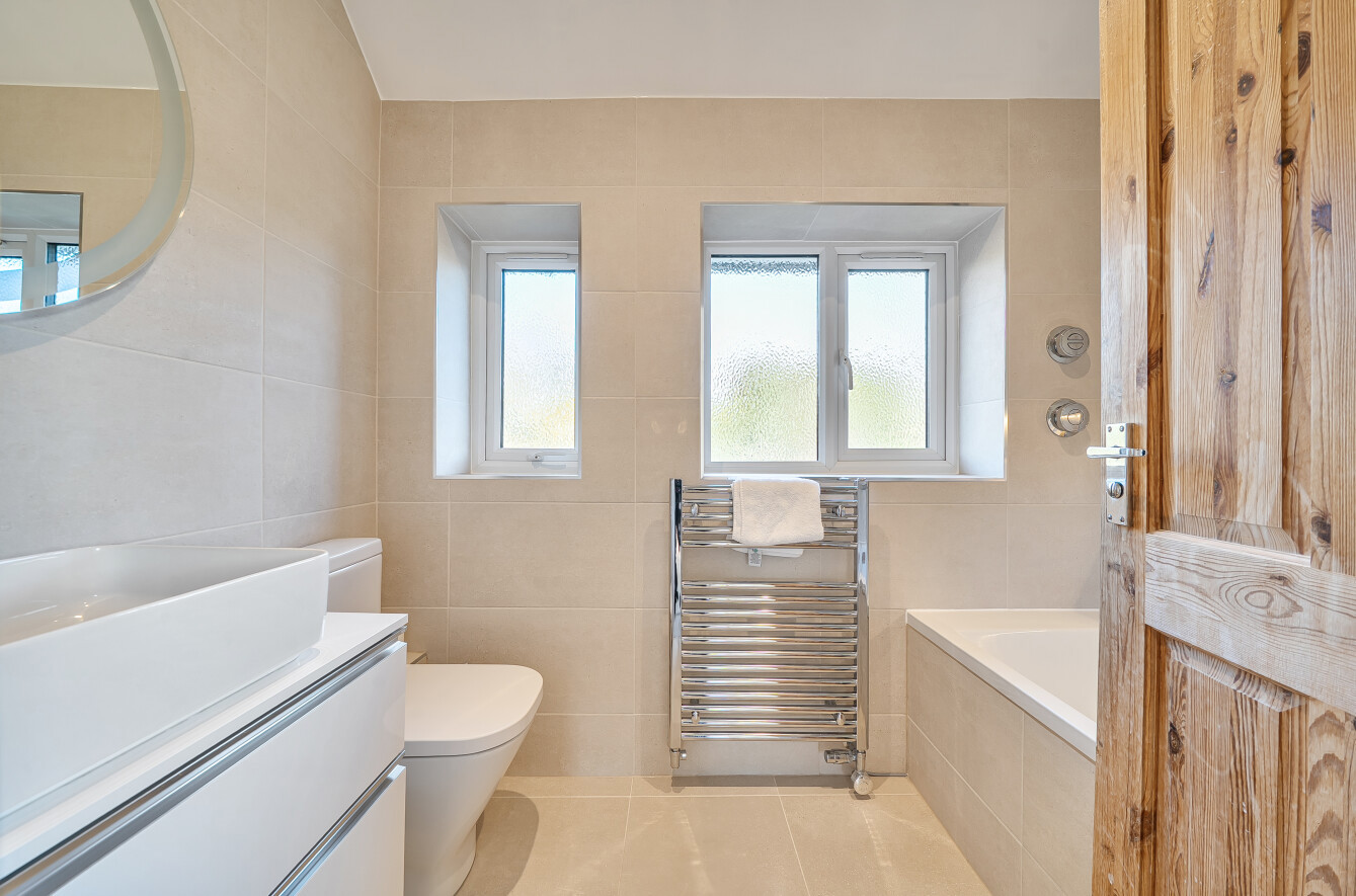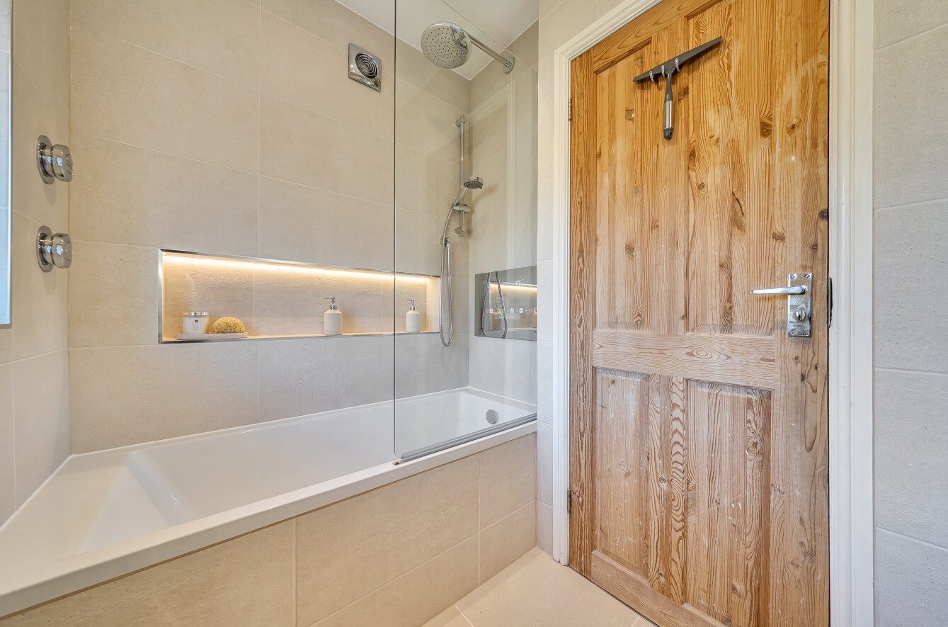 To the first floor the master bedroom benefits from a full run of fitted wardrobes. There are two further bedrooms to this floor and a newly refurbished bathroom with Aqualisa shower and a TV.