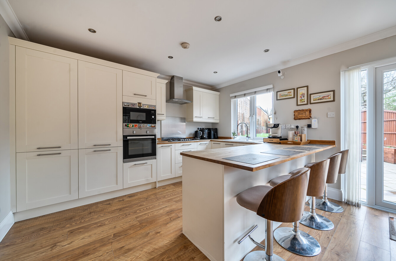 Upon entering, you’re welcomed by a bright hallway leading to a spacious triple-aspect lounge where natural light floods the room. To the rear, the hallway opens into an impressive open-plan kitchen and dining area, featuring sleek, fully integrated appliances, a stylish breakfast bar and patio doors that open directly onto the garden - an ideal setup for modern family living and entertaining. A cloakroom and W.C. complete the ground floor.