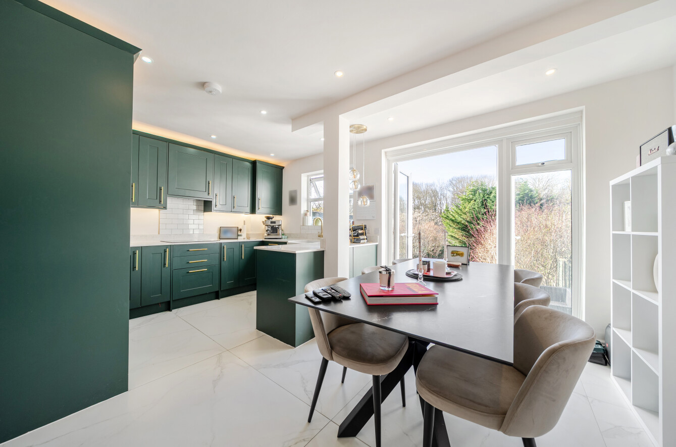The front door opens into an inviting entrance hall with a bow window to the side providing natural light and a useful understairs storage cupboard. To the front is an elegant living room with a bay window, feature multi-fuel stove and fireplace and wood effect flooring. Across the rear of the property is a stunning openplan kitchen/dining room with marble effect tiled flooring and double doors opening out to the rear garden. The kitchen comprises a comprehensive range of striking wall and base units with space for appliances.