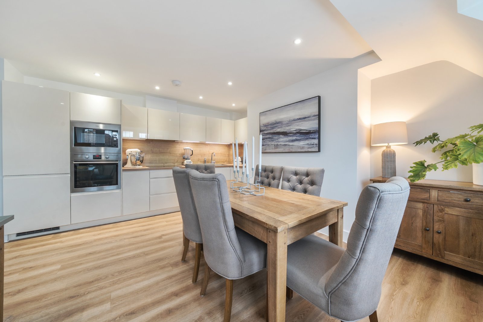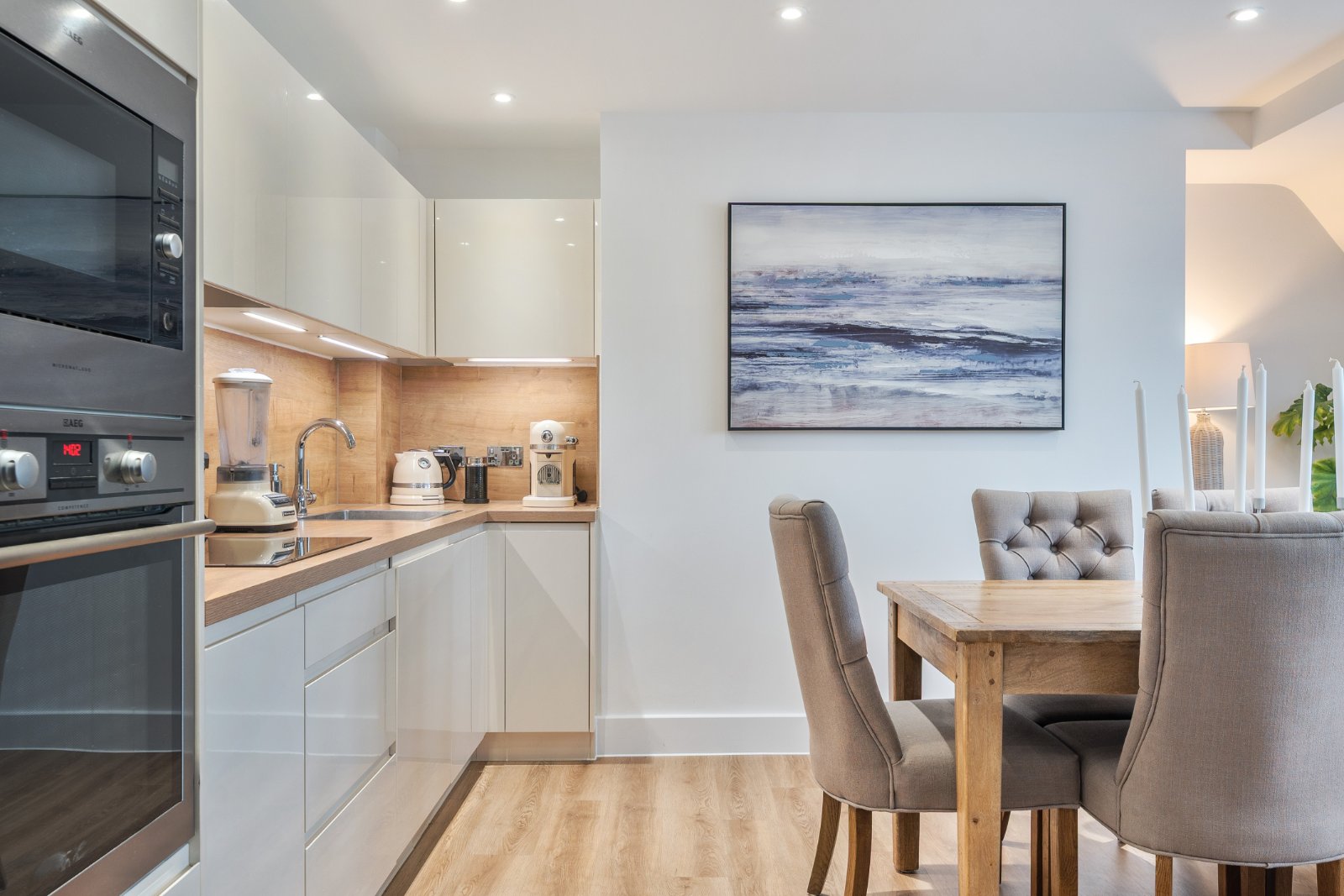 The property offers flexible living accommodation with an entrance hall with useful storage cupboard and an open plan kitchen/living room. The kitchen comprises a range of sleek white wall and base units with space for a dining table and the living room features an attractive fireplace and custom built cabinetry.