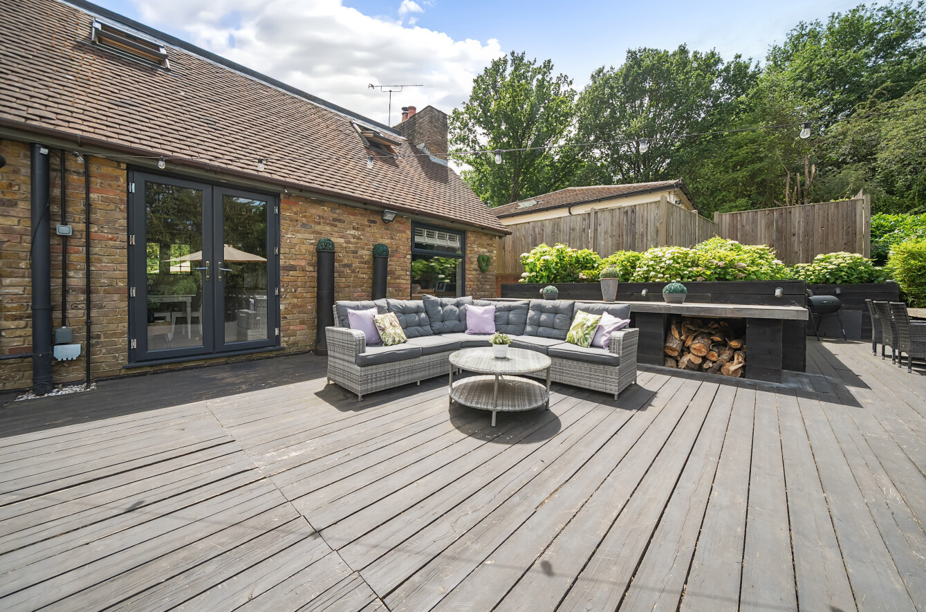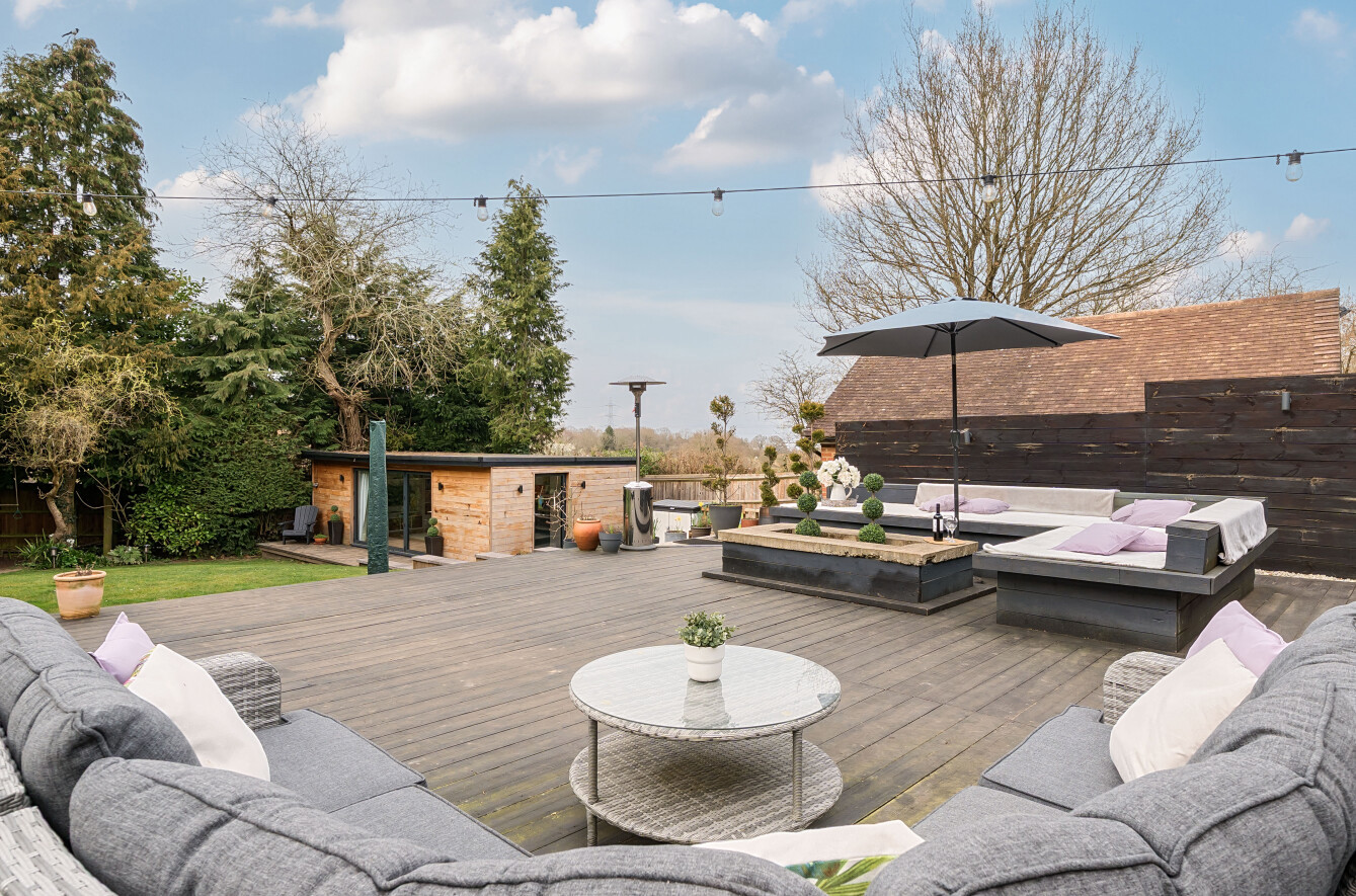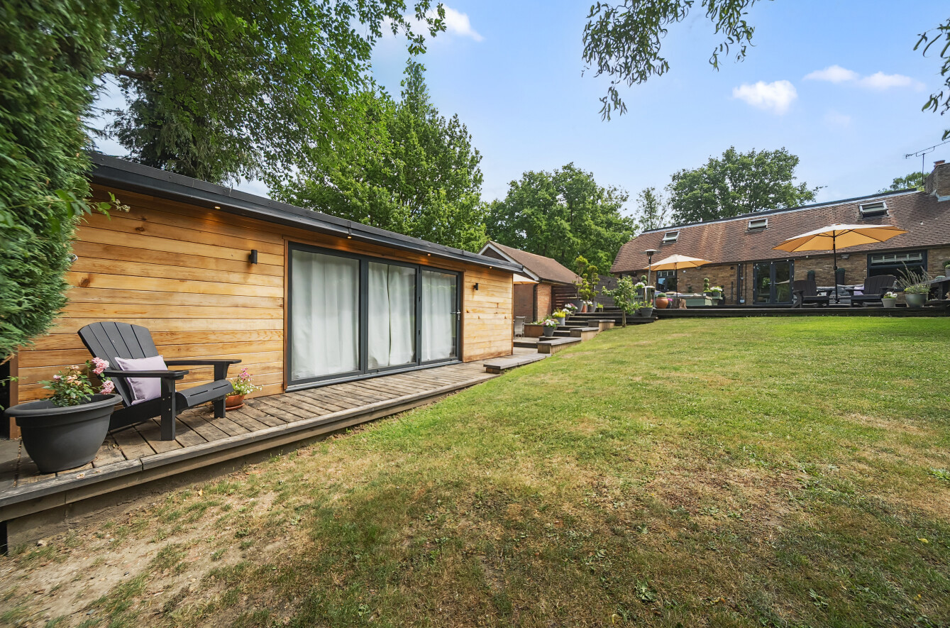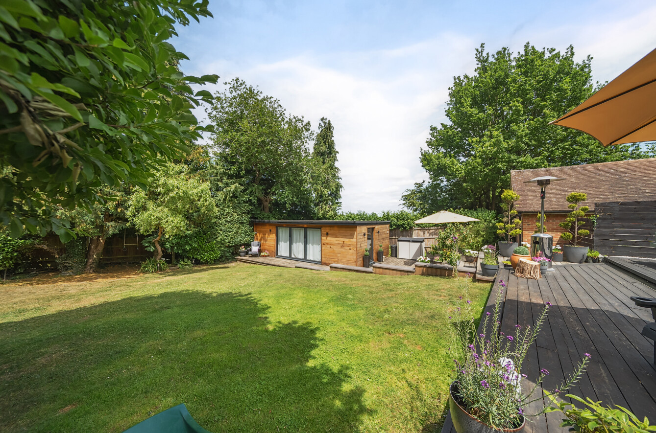 The stunning garden measures approximately 105' x 89'. It has a large decked seating area accessible from the kitchen making it ideal for al-fresco dining. The remainder is laid to lawn with a backdrop of mature trees and shrubs. Also in the garden is a timber summerhouse which is ideal for use as a home office, gym or teenagers den.