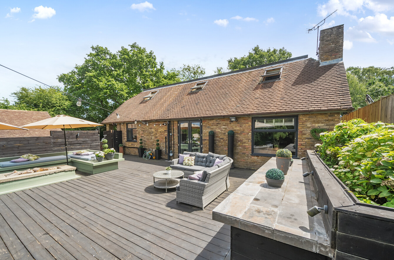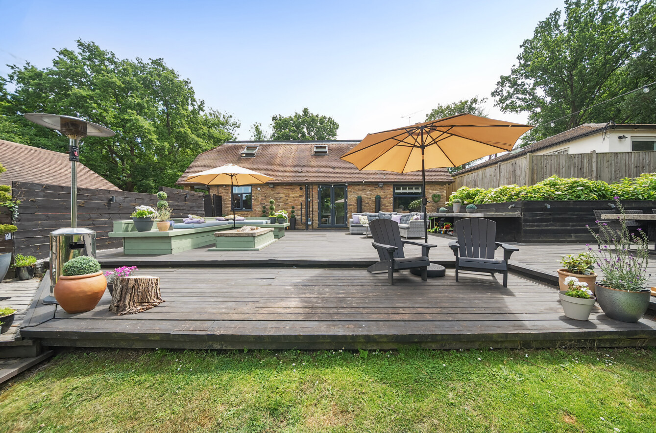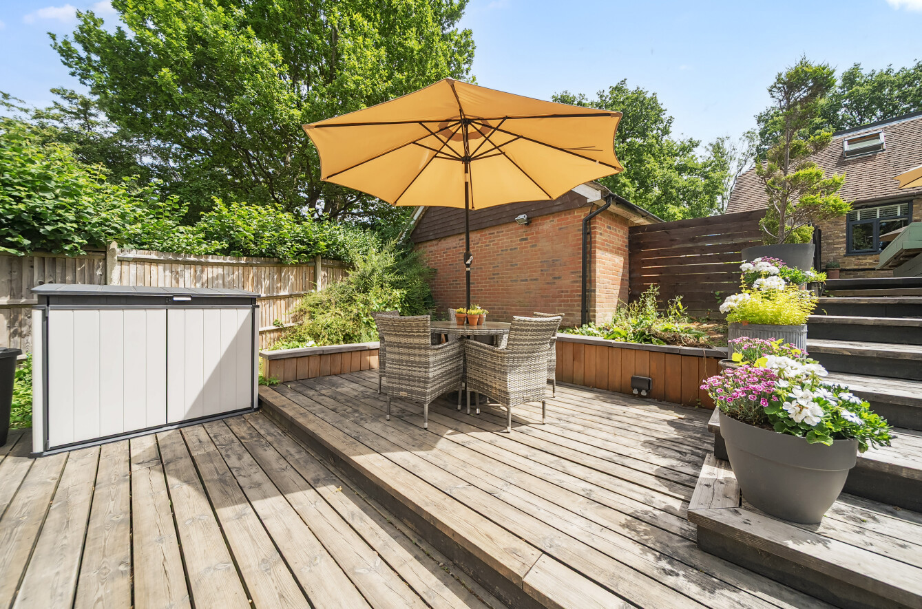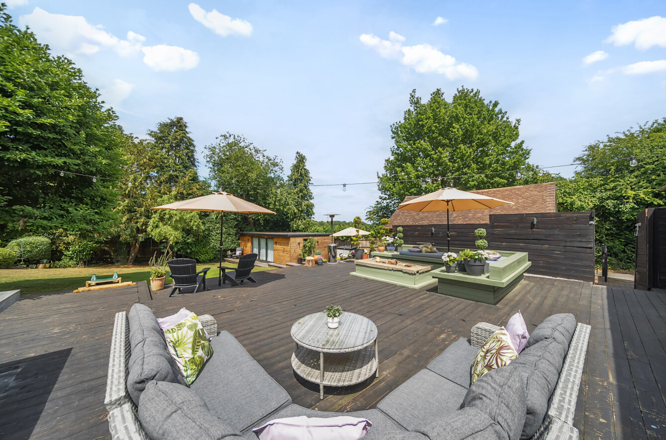 The stunning garden measures approximately 105' x 89'. It has a large decked seating area accessible from the kitchen making it ideal for al-fresco dining. The remainder is laid to lawn with a backdrop of mature trees and shrubs. Also in the garden is a timber summerhouse which is ideal for use as a home office, gym or teenagers den.